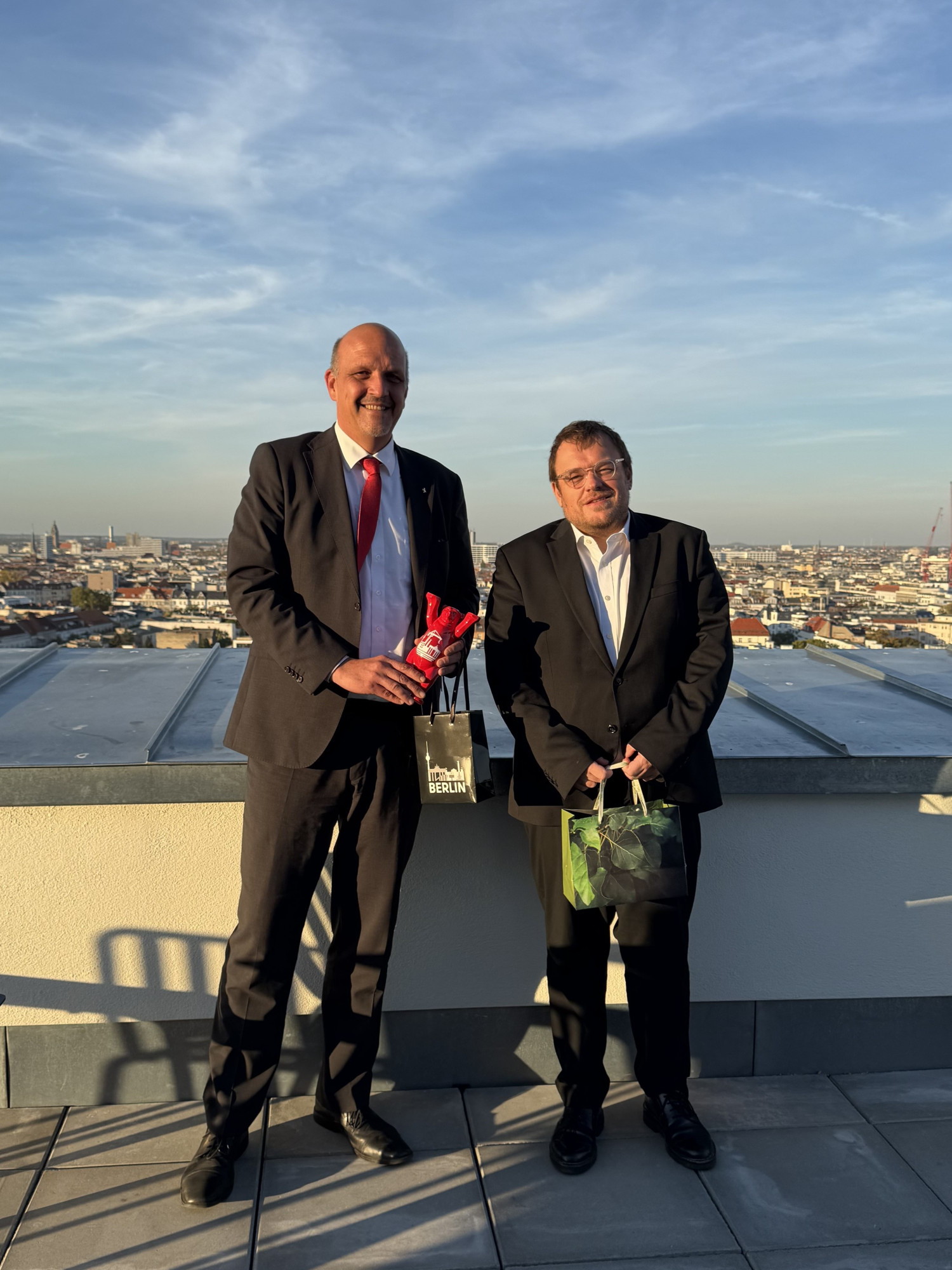 Stephan Machulik, Staatssekretär für Wohnen und Mieterschutz im Berliner Senat im Bereich Stadtentwicklung, Bauwesen und Wohnen, und Minister Simon Maljevac | Autor Ministerium für Solidarische Zukunft
