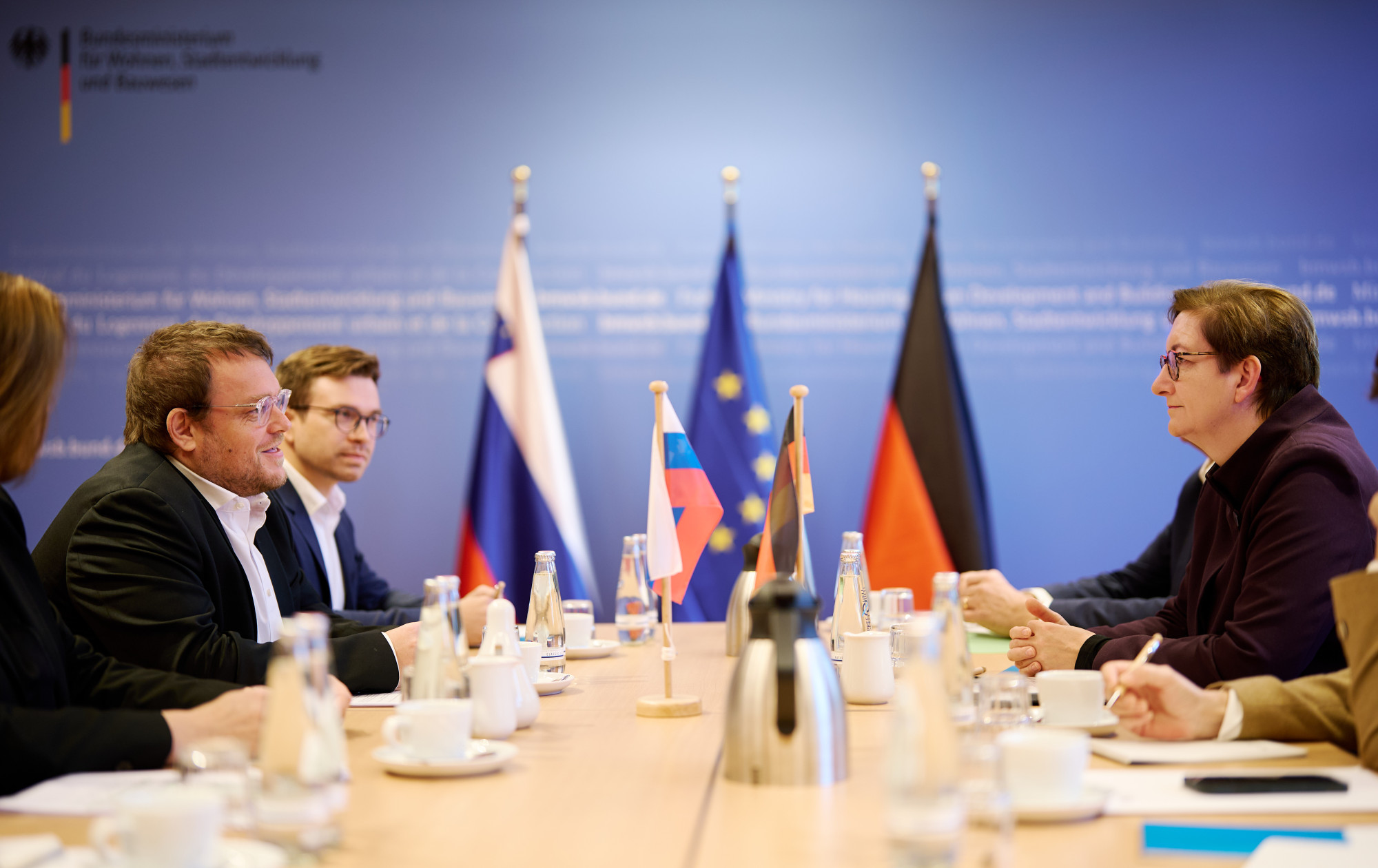 Minister Simon Maljevac und Ministerin Klara Geywitz tauschten beim bilateralen Treffen Informationen über die Situation im Wohnungswesen in Slowenien und Deutschland aus und diskutierten über die Ziele, die sich die Regierungen in Berlin und Ljubljana zur Bewältigung der Wohnungsnot gesetzt haben. Die beiden Minister stellten in den Gesprächen fest, dass sie ähnliche Ansichten zu Lösungen zur Verbesserung der Wohnverhältnisse in mehreren Bereichen haben. Sie hoben unter anderem die Bedeutung der Bereitstellung umfangreicher finanzieller Mittel für den Wohnungsbau hervor. Beide waren sich einig, dass die Europäische Investitionsbank die Finanzierungsmethoden für den öffentlichen Wohnungsbau anpassen muss, da die derzeitigen Finanzierungsbedingungen für die meisten Investoren in der Europäischen Union schwer zugänglich sind.