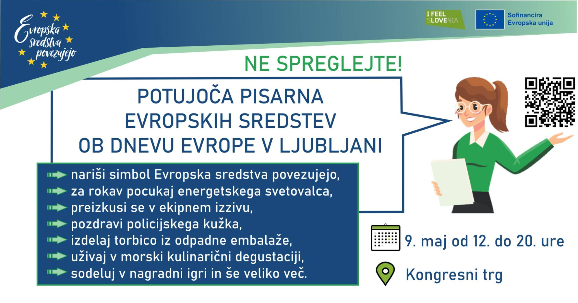 V okviru Potuoče pisarne "Evropska sredstva povezujejo" se bodo predstavili različni programi, ki z evropskimi sredstvi podpirajo razvoj Slovenije - Program evropske kohezijske politike 2021-2027, Interreg programi, Program za pomorstvo, ribištvo in akvakulturo, skladi Evropske unije s področja notranjih zadev, Program za odpravljanje materialne prikrajšanosti in Skupna kmetijska politika.