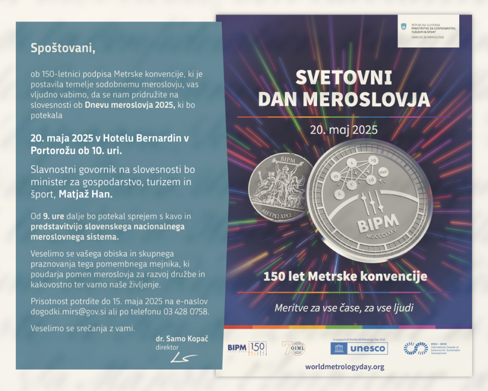 z veseljem vas vabimo, da se nam pridružite na praznovanju Dneva meroslovja 2025, ki bo potekalo 20. maja 2025 in s katerim bomo zaznamovali 150. obletnico podpisa Metrske konvencije. S tem prelomnim dogodkom je bil ustanovljen tudi Mednarodni urad za uteži in mere (BIPM), kot ena najstarejših mednarodnih organizacij, in postavljene osnove za sedanji Mednarodni sistem merskih enot SI, ki zagotavlja globalno usklajen sistem merjenj.