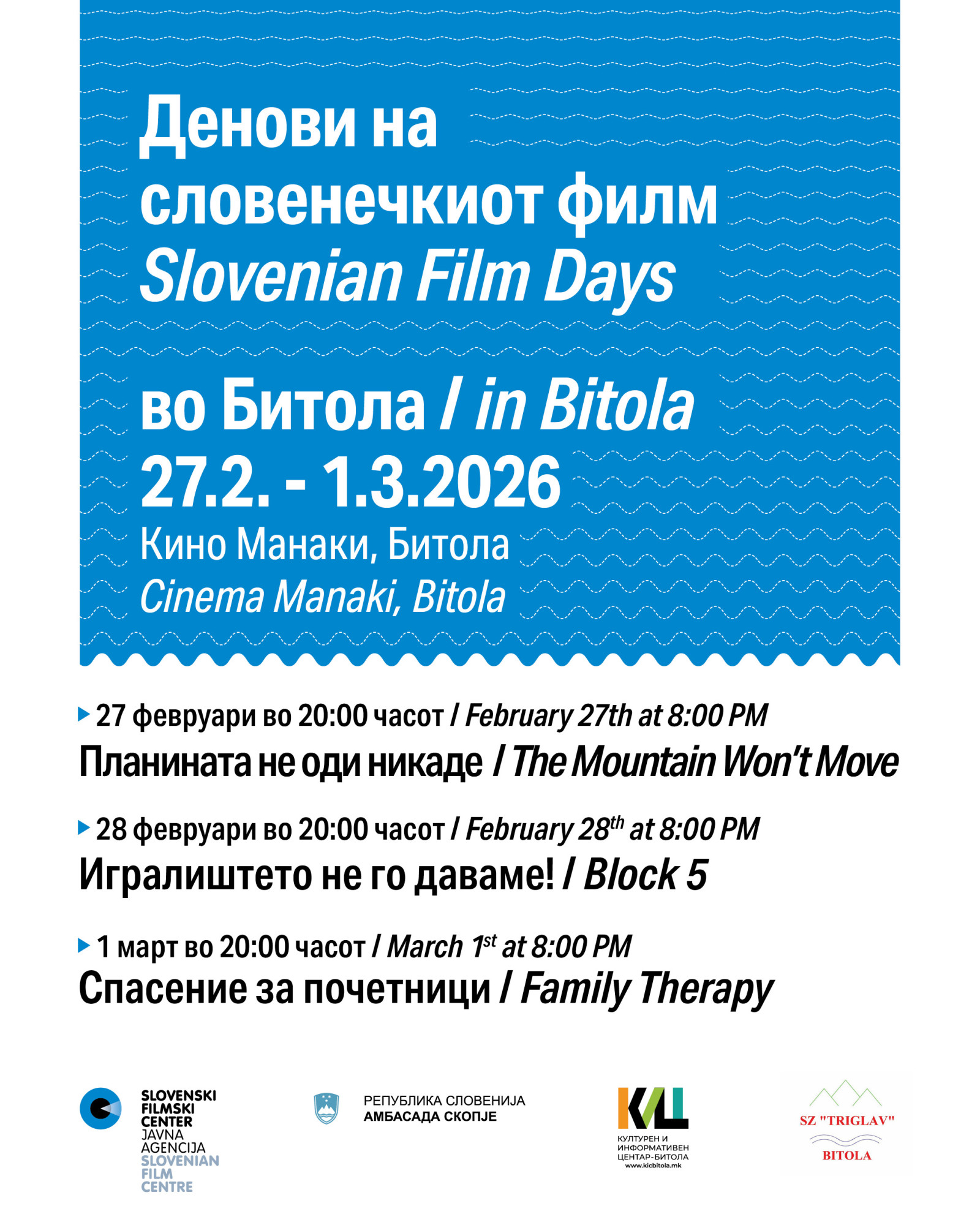 V okviru Dnevov slovenskega filma v Bitoli bodo predvajani trije slovenski filmi. Prvi večer bo predvajan dokumentarni film Gora se ne bo premaknila, ki ga je režirala Petra Seliškar. V soboto, 28. februarja, bo predvajan mladinski film režiserja Klemna Dvornika z naslovom Igrišča ne damo, v nedeljo, 1. marca, pa film Odrešitev za začetnike, ki ga je napisala in režirala Sonja Prosenc.