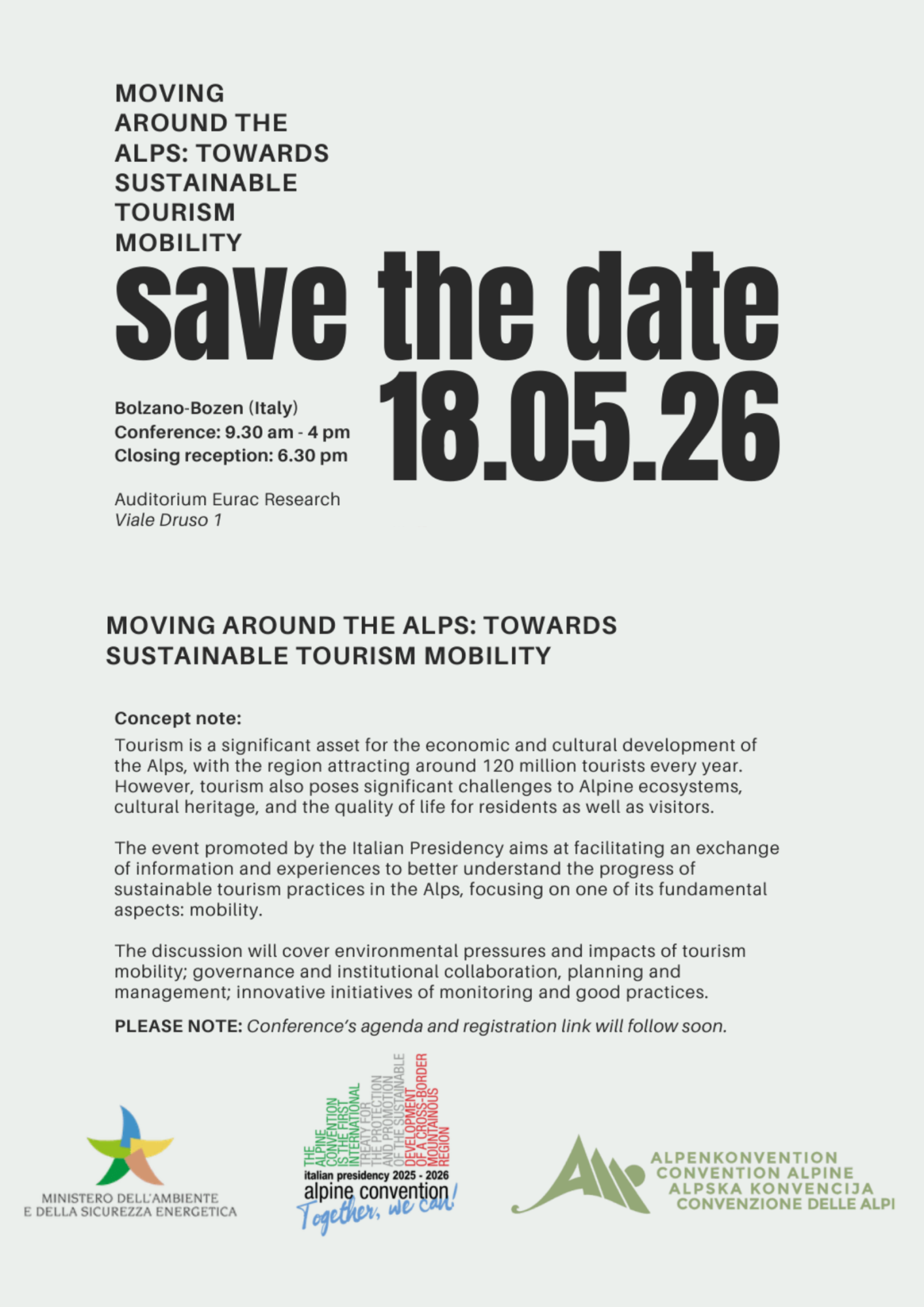Konferenca, na pobudo italijanskega predsedstva Alpski konvenciji 2025-2026, bo namenjena izmenjavi znanj, izkušenj in dobrih praks na področju trajnostne turistične mobilnosti v Alpah. V ospredju razprav bodo: