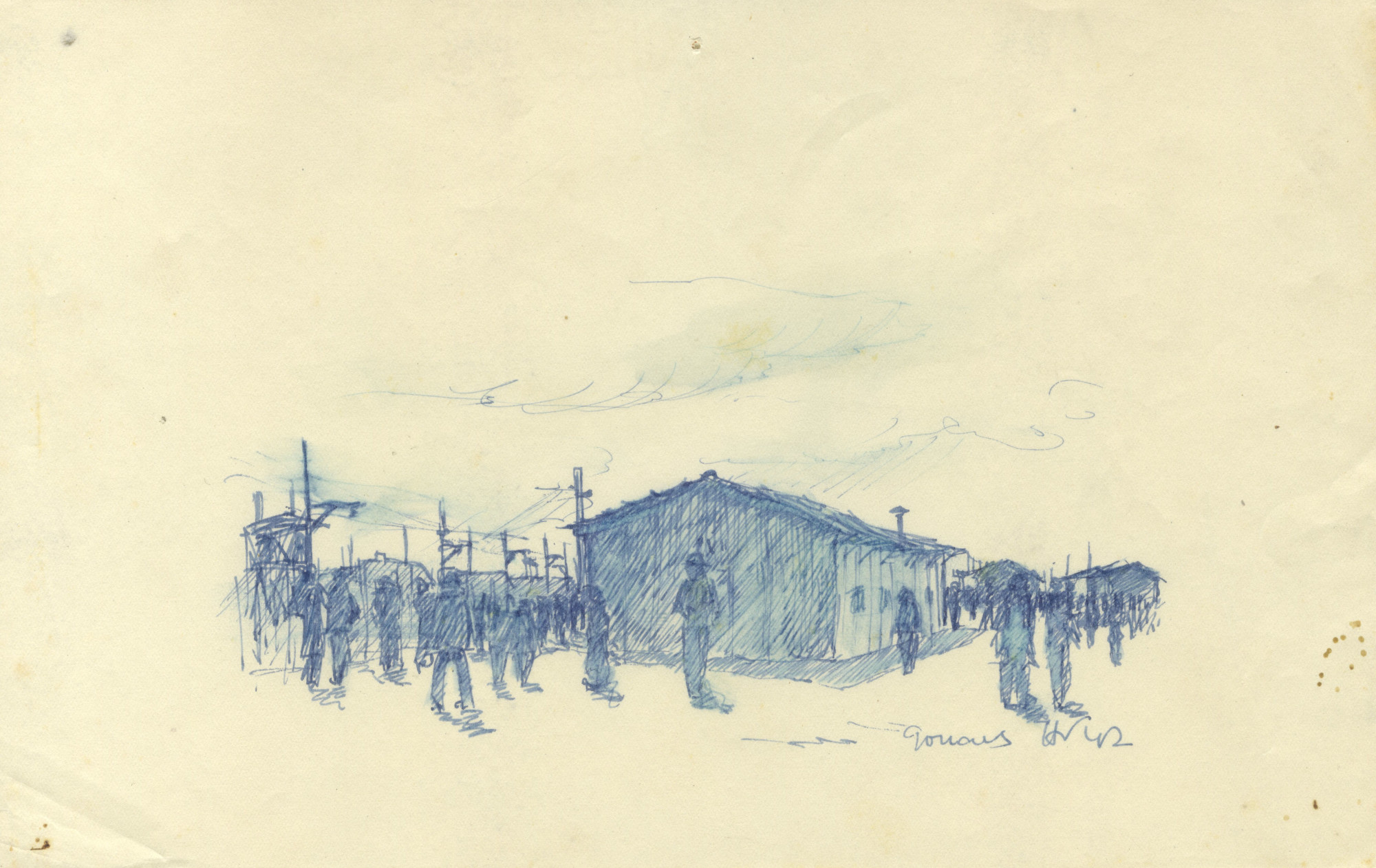 On March 15, 1942, Igor Breznik was arrested in a raid by the Italian police. According to the Sokol Legion, their members were given away by members of the Liberation Front. He was taken away to the concentration camp in Čignij and from there to the concentration camp in Gonars. He was there for six months. When he returned from Gonars he brought with him the mentioned drawings and pictures. He was deeply upset about the news that the partisans killed his friend Milan Gaberščik. Born in Krmin in 1918, Gaberščik was Igor's schoolfriend in grammar school. He was a lawyer and one of the leaders of the Yugoslav National Academic Association Jugoslavia. He was arrested in a raid by the Italians and was on board of the train for Gonars which was attacked by the partisans on the night of June 28, 1942: the partisans captured the internees on the train, and executed some of them, among them also Gaberščik. Upon his return from Gonars, Breznik and his brother Mark wanted to go »to the woods« in the summer of 1943; he acquired fake passes so that they could leave Ljubljana but changed his mind once he found out that in September 1943 the partisans attacked the Chetnik outpost in Grčarice, where there was also a number of the members of Sokol.