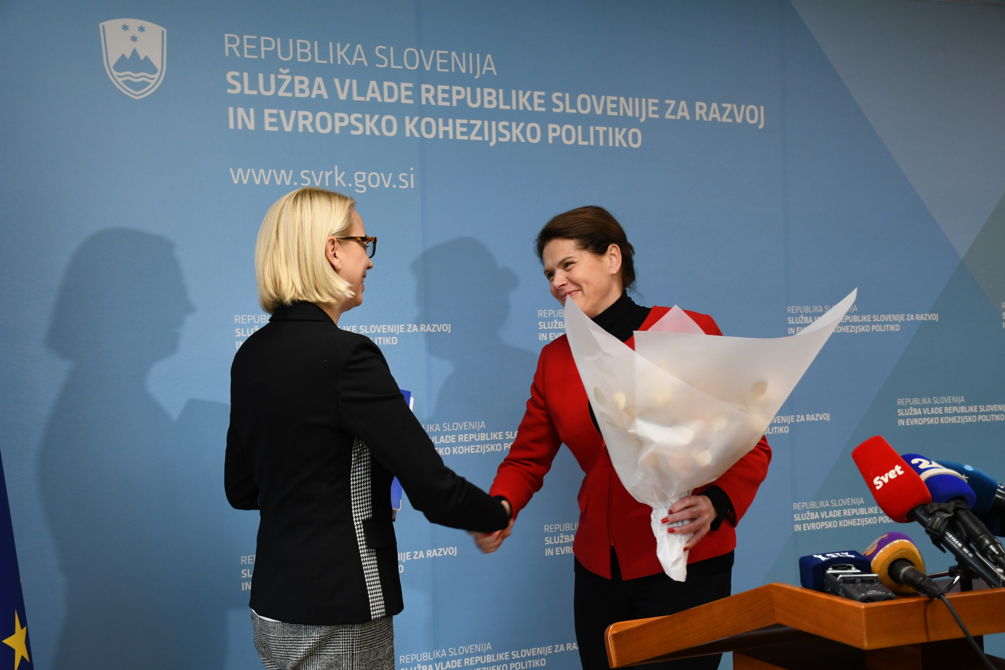 Dr Angelika Mlinar commended Ms Bratušek and her team for their dedicated work and efforts while in charge of the portfolio, and thanked for the advice and directions she was given. ‘’I am being briefed and up to speed right now; my team and I are well aware of the challenges ahead, but I can assure you that we will do everything in our power to overcome them and accomplish the goals set. GODC has been subject to criticism lately, but I would like to point out that things are not as bad as they might seem. What we need now is to stay focused and redouble our efforts to see to it that the funding made available to Slovenia in the 2014-2020 funding period is fully spent; we also need to open up the dialogue with other ministries, while proceeding full steam ahead with preparing the next programming period,’’ underlined Mlinar.