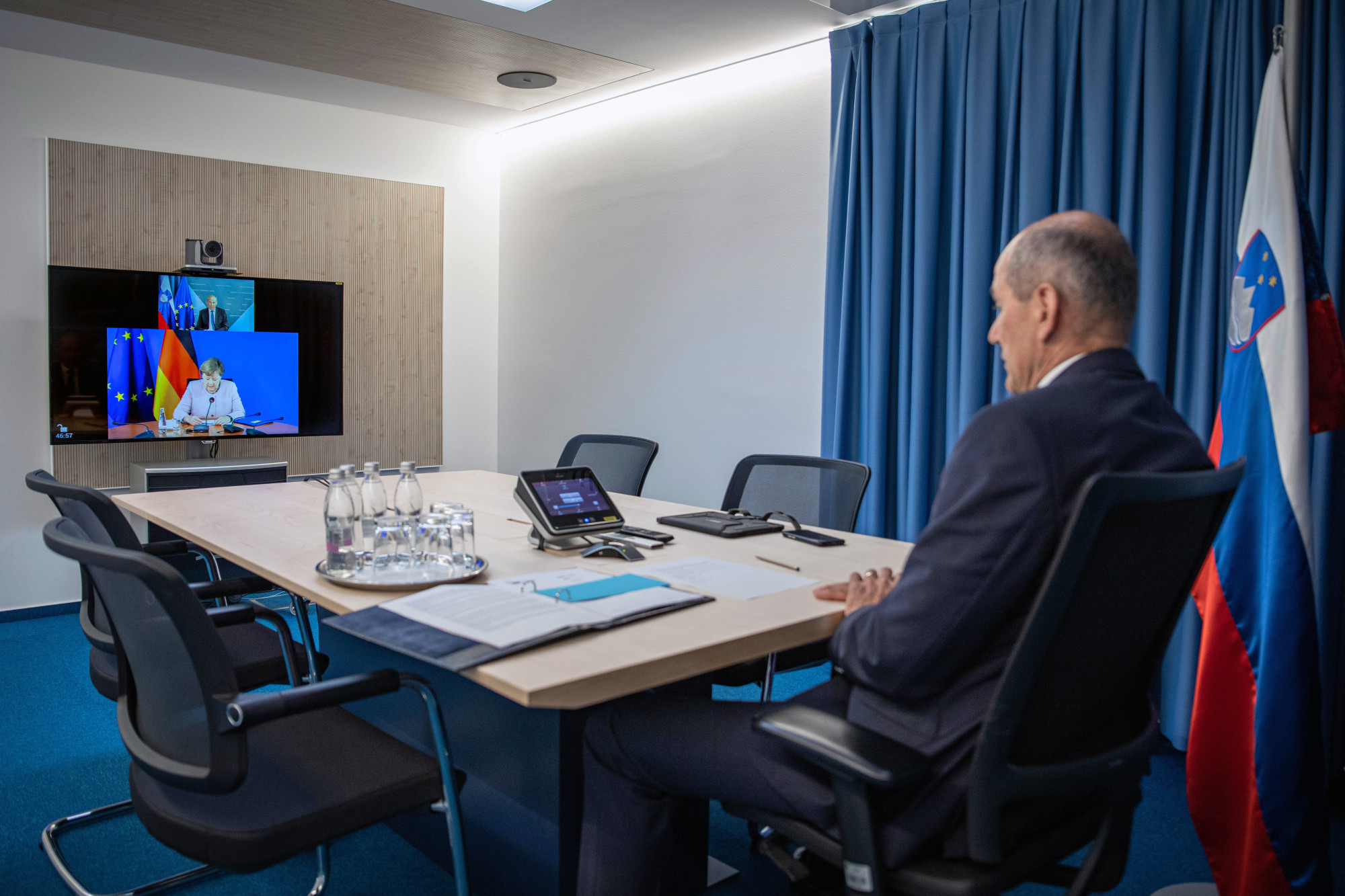 Prime Minister Janez Janša in a videoconference with German Chancellor Angela Merkel and Portuguese Prime Minister António Costa