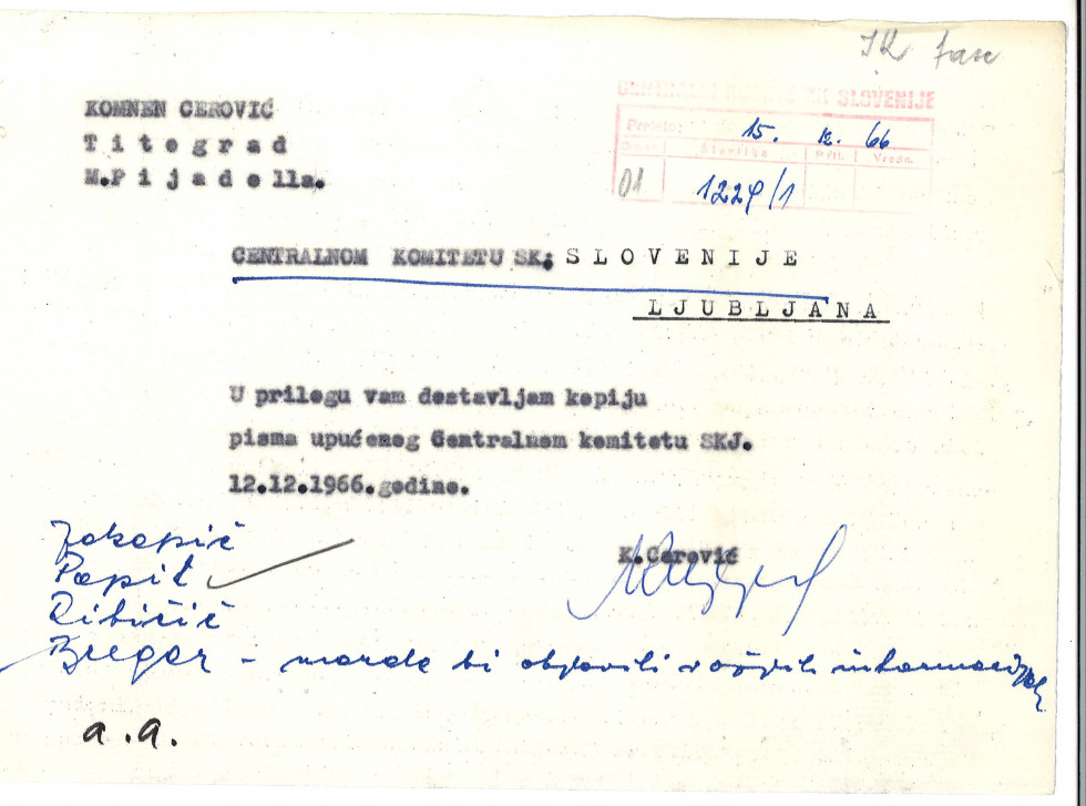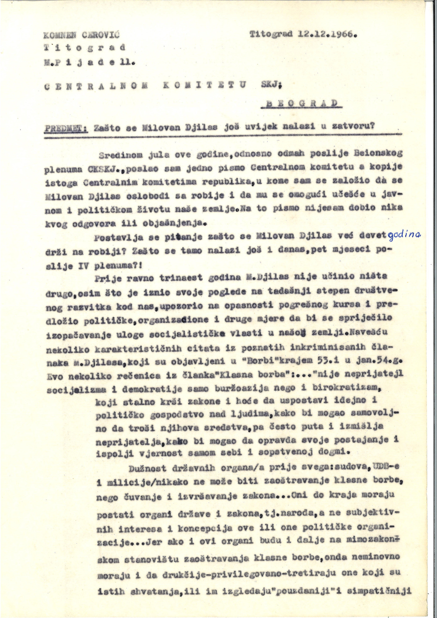 This month's archivalia is a lengthy letter written by the Montenegrin partisan and national hero Komnen Cerović (1916-2000) and sent at the end of 1966 to the Central Committee of the League of Communists of Yugoslavia to which Cerović had unsuccessfully sent a similar letter already a couple of months earlier. The letter presented here was simultaneously also sent for the information of the Central Committee of the League of Communists of Slovenia and copies of it were sent to all of the Yugoslav republic central committees. Cerović titled his letter with a question of why his compatriot and friend Milovan Đilas (1911-1995) was after nine years still kept in a Yugoslav prison. In his letter, Cerović was very critical of the Yugoslav authorities and media, which he believed had been dismissing Đilas's ideas and obstructing his actions in every possible way for the previous thirteen years.