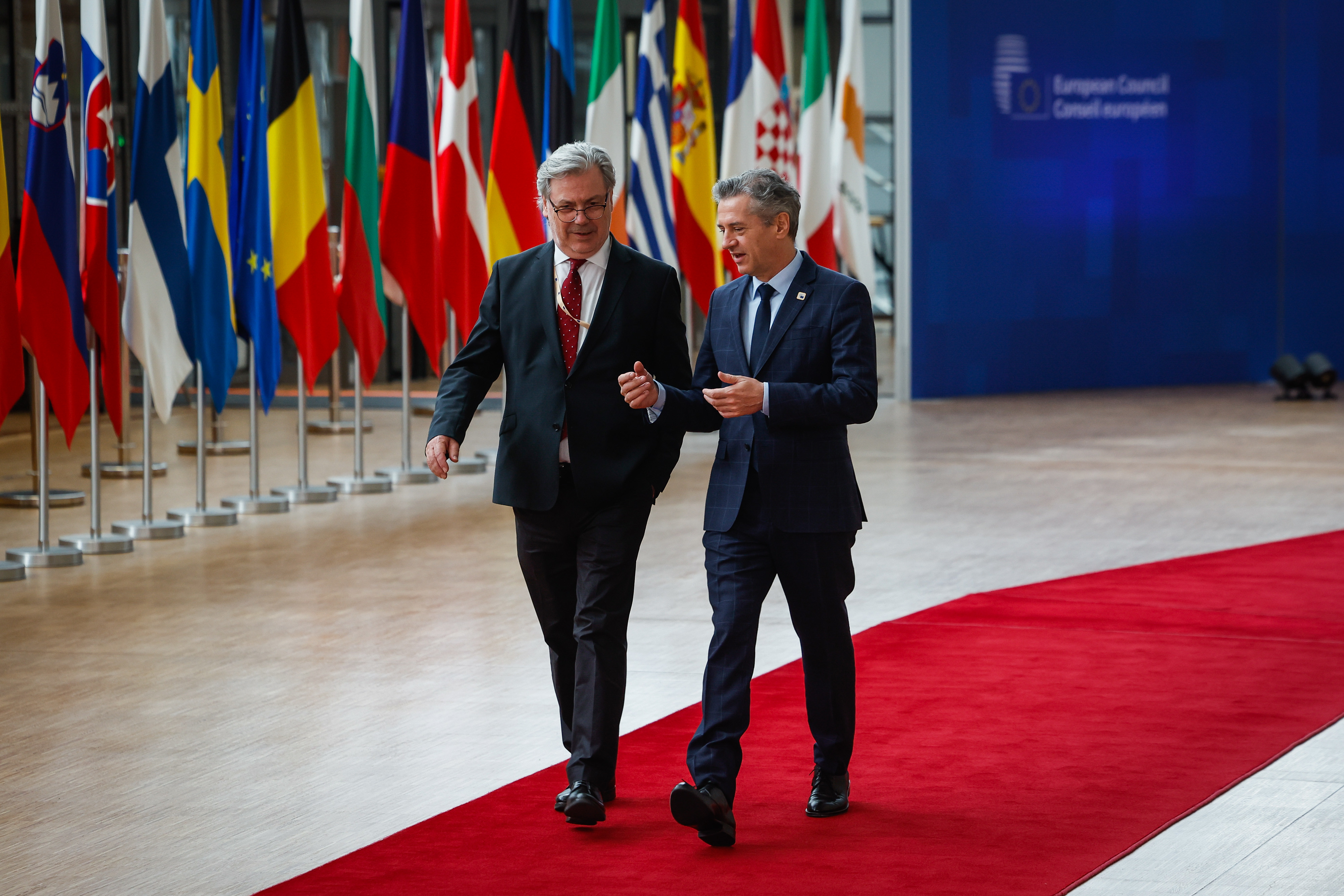 Prime Minister Robert Golob and State Secretary for National Security Vojko Volk upon arrival at European Council meeting. | Author Anže Malovrh, STA