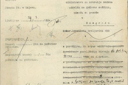 However, the latter was not the case with Wilhelm Palz, since this “German vagabond artist” had been roaming the streets of Ljubljana for only a couple of months before he was checked up by the General Police Directorate in Ljubljana in October 1922. The Directorate sent an inquiry into Palz’s municipality of residence to the Commission for Internal Affairs. The inquiry, together with the enclosed documents, was then sent to the Ministry of the Internal Affairs in Belgrade, which passed this task to the embassy of the Kingdom of Serbs, Croats, and Slovenes in Germany. Since the inquiry dragged on for months, the ministry in the meantime issued a decree, which unfortunately has not been preserved, but likely allowed Palz to stay in Ljubljana without any restrictions. In March 1924, Palz, using a pseudonym Haij Funkaij Dong, submitted an application for the extension of his visa to stay in the country, which the administrative department of the Great Župan of the Ljubljana Oblast forwarded to the ministry in Belgrade without hesitation “for political reasons”. The official of the administrative department had not noticed that the application was submitted by Wilhelm Palz, who at the time was in the process of being expulsed, but this observation did not escape the officials at the Belgrade ministry. In June that year, the ministry sent a letter, demanding to locate Palz and enclosing a report on determining his right of residence, which had apparently got stuck at the ministry in the middle of 1923 due to an incorrect file number. Whether the police in Ljubljana then managed to track down and expulse Palz is unclear, as the entire case eventually became time-barred.
