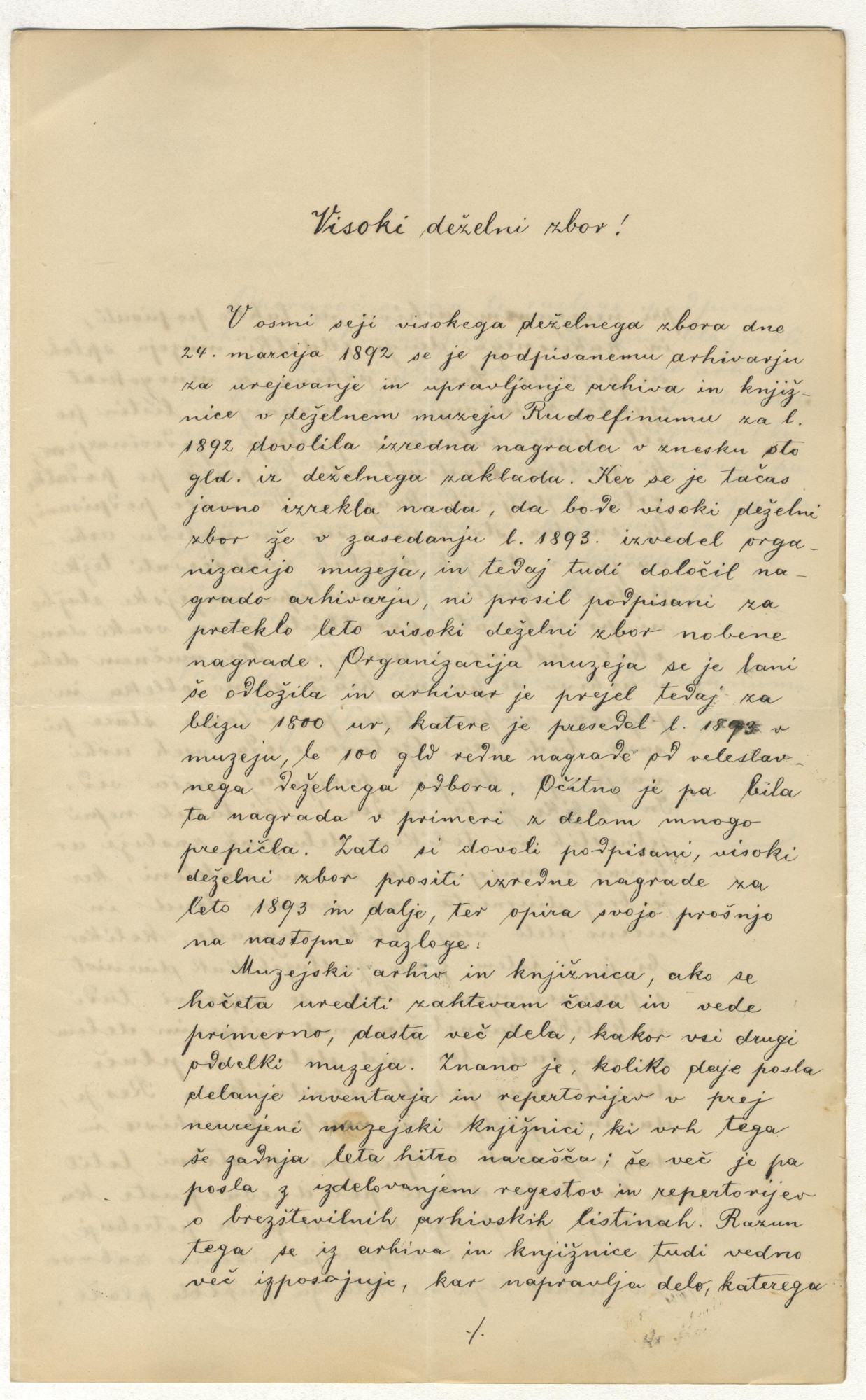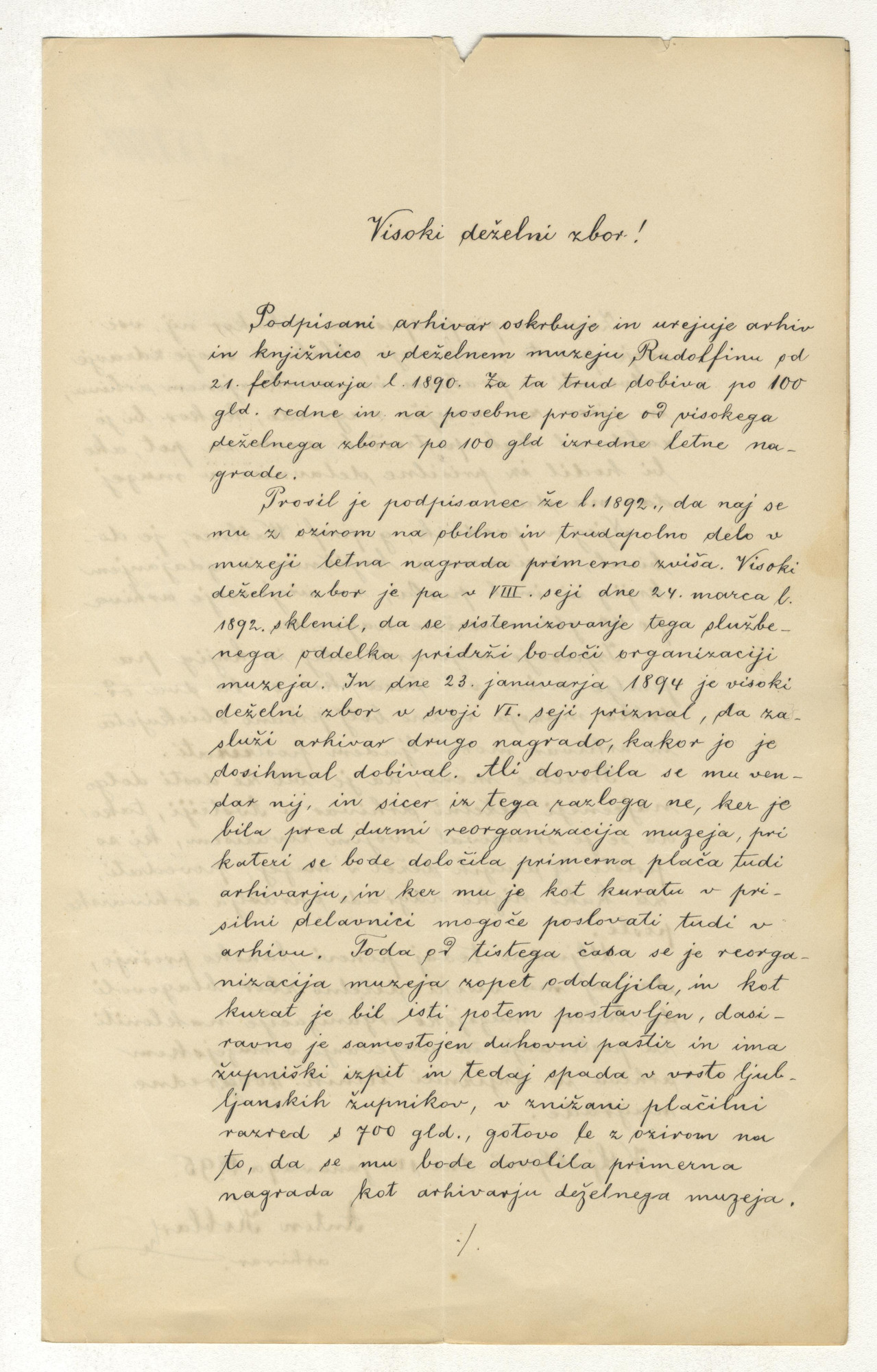 “The head of the museum archive in Rudolfinum”, or more precisely “the archivist” Koblar, did not hesitate to act, and on January 14, 1894, he wrote to the Provincial Diet, asking for a 100-gulden reward for the years 1893 and 1894. He reminded the Diet that, in the spring of 1892, he had already been granted a reward of 100 gulden for his »arrangement and management of the archive and library”. He explained that he made no special request for the year 1893, because the matter was expected to be resolved with the planned reorganization of the museum, which, however, never took place. Therefore, for 1,800 hours of his work in 1893, he had received only the regular reward of 100 gulden, which was not nearly enough. He justified his request for a special reward in vivid terms, as can be seen in the document reproduced for the purpose of this month’s archivalia. Let us just take a look at a few excerpts: “The gruelling work at the archive does not merely cover one’s clothes and lungs in dust but also strains one’s eyes when reading old scripts. The early loss of eyesight is the inevitable fate of every archivist. /…/ It is true, that the author of this letter likes working at the archive and that it was his love of archival work that inspired him to do it. But to spend one’s days compiling dull catalogues for others, and one’s nights working on what one needs for oneself – this is no pleasure for anyone, and no one would do it for such meagre pay.” For these reasons, Koblar asked the Provincial Diet to grant him a special reward of 300 gulden for the year 1983 (he had already received a regular reward of 100 gulden), and to award him a continuing annual payment of 400 gulden from the “provincial treasury” – to remain in effect until the planned reorganization of the museum was completed and for as long as the Diet remained satisfied with his work.