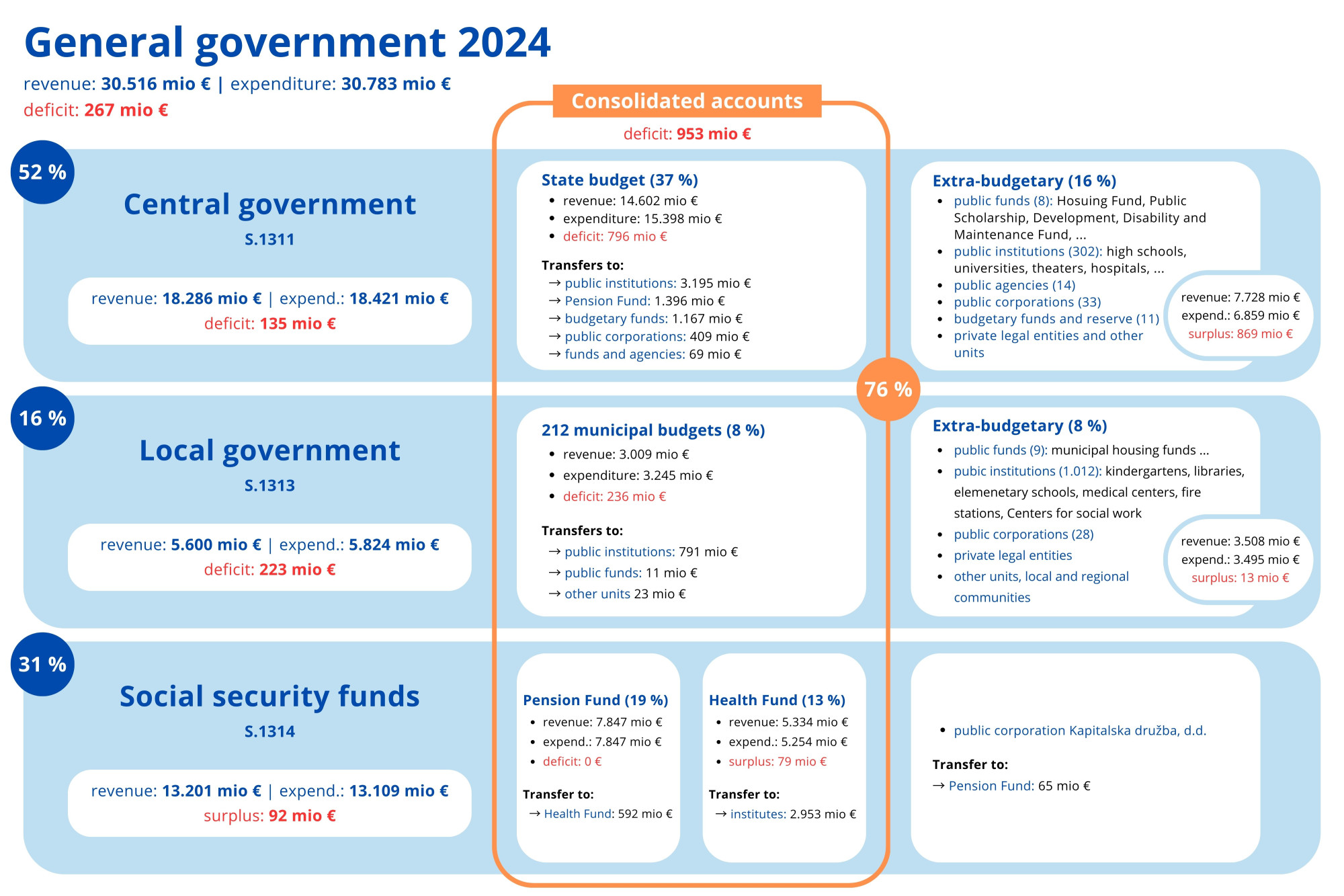 In addition to the four public finance budgets, the general government sector covers also revenue and expenditure of indirect budget users and other institutional units. All reporting requirements prescribed by national and EU law are thus fulfilled, with the applied methodology ensuring the international comparability of the data.