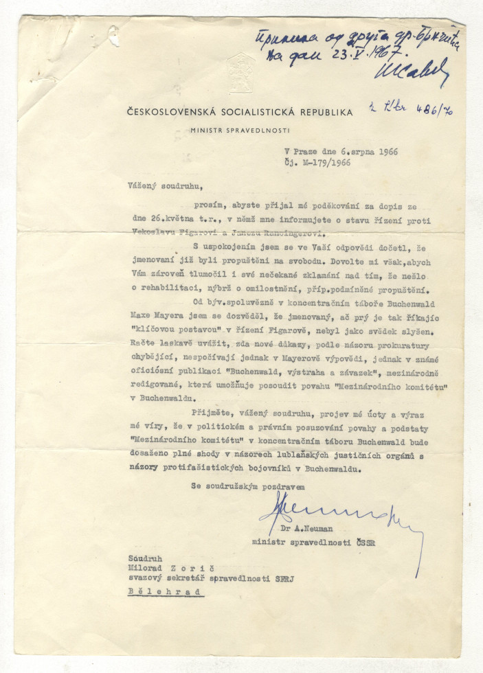 Pismo češkoslovaškega ministra za pravosodje dr. Neumana zveznemu sekretarju za pravosodje SFRJ glede rehabilitacije Vekoslava Figarja in Ivana Ranzingerja