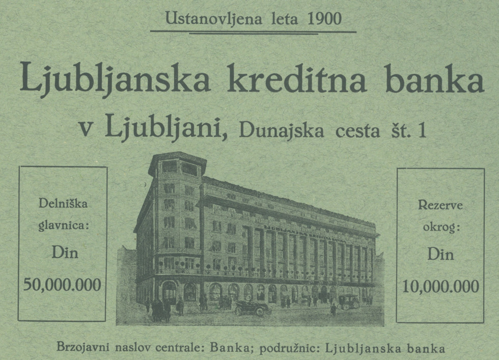 Pred nami je prva arhivalija s področja bančništva. Slovenci se lahko pohvalimo s prvo bančno ustanovo – Kranjsko hranilnico – že leta 1820. Bila je druga v vsej Avstriji in ena redkih v evropskem prostoru, a vendar se v 19. stoletju slovensko zasebno bančništvo v obliki delniških družb ni razvilo. Kreditno zadružništvo je opravljalo zgolj vlogo denarnega posredništva za drobno gospodarstvo z mobilizacijo prihrankov v posojila za kmete in obrtnike. Na prelomu v 20. stoletje tako v Ljubljani ni bilo slovenske banke, ki bi mogla ustreči povpraševanju slovenskih podjetnikov, željnih domačega vira kapitala in finančnih uslug. Bančne delniške družbe so sicer obstajale v Mariboru in Prekmurju, a so delale kot zadruge v lokalnih okvirih. Kranjska industrijska družba, denimo, je poslovala z bankami v Trstu in Gradcu.