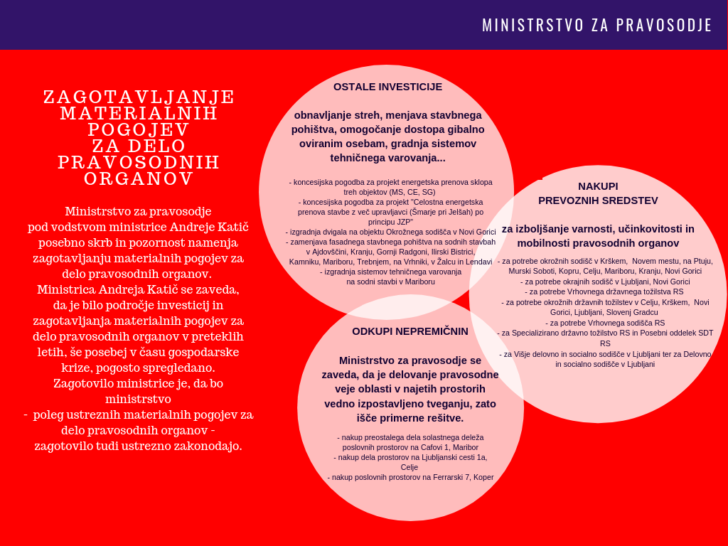 Ministrstvo za pravosodje posebno skrb namenja zagotavljanju materialnih pogojev pravosodnih organov. Med drugim se je za sodišča v Mariboru, Novi Gorici, Celju in Trebnjem zagotovilo lastne prostore, sodne stavbe v Murski Soboti, Celju in Slovenj Gradcu pa energetsko prenovilo. Poleg tega se obnavljajo strehe, menja stavbno pohištvo, omogoča dostop gibalno oviranim osebam, gradi sisteme tehničnega varovanja, in posodablja vozne parke.
