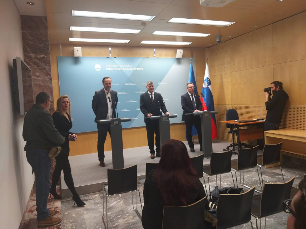novinarska konferenca sogovorniki (minister Medved, državni sekretar Behin, predsednik Sveta AKOS Dekleva) | Avtor: MJU