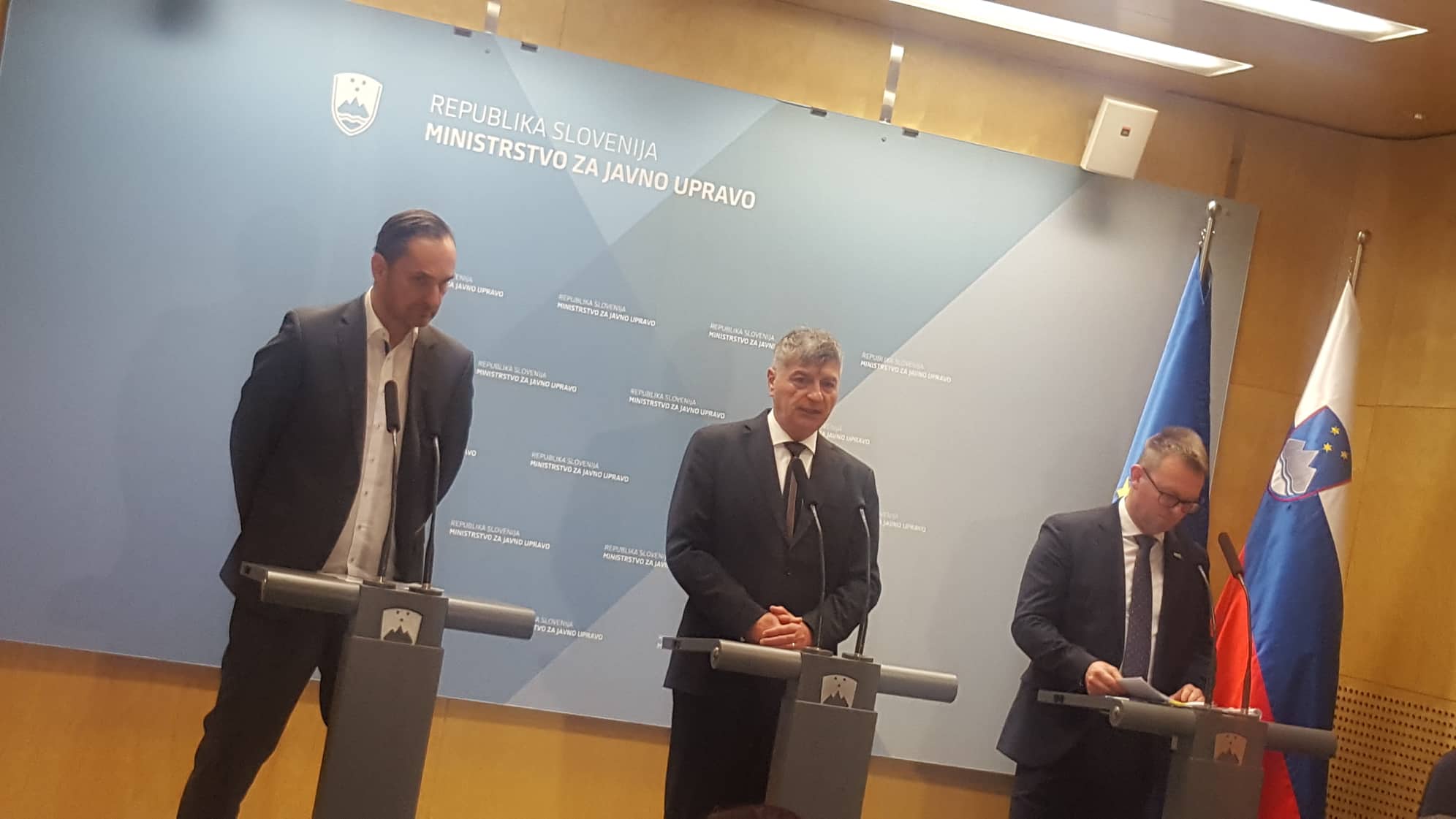 novinarska konferenca sogovorniki (minister Medved, državni sekretar Behin, predsednik Sveta AKOS Dekleva) | Avtor: MJU