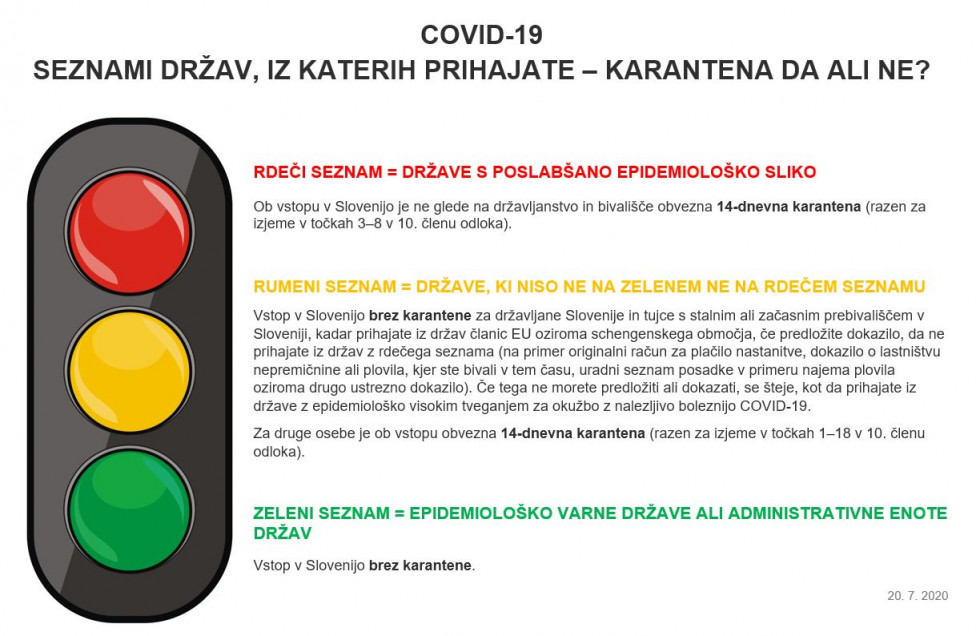 Državljani Slovenije ne glede na bivališče in tujci s stalnim ali začasnim prebivališčem v Sloveniji, ki prihajajo iz držav članic EU oziroma schengenskega območja, lahko v Slovenijo vstopijo brez karantene, če predložijo dokazilo, da ne prihajajo iz držav z epidemiološko visokim tveganjem za okužbo z nalezljivo boleznijo COVID-19 (rdeči seznam), na primer originalni račun za plačilo nastanitve v teh državah, dokazilo o lastništvu nepremičnine ali plovila, na katerem so bivali, uradni seznam posadke v primeru najema plovila oziroma drugo ustrezno dokazilo. Če tega ne morejo predložiti ali dokazati, se šteje, kot da prihajajo iz države z rdečega seznama.