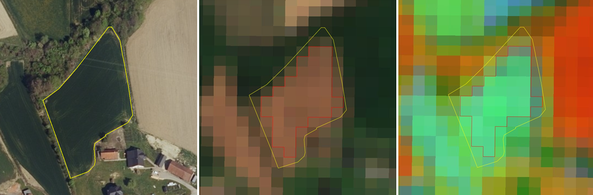 Na prvem posnetku je prikazan ortofoto posnetek z 0,5 metrsko prostorsko resolucijo, na drugem in tretjem posnetku pa ista površina posneta s satelitom Sentinel-2 na dan 25. 7. 2019. Posnetka se razlikujeta glede na uporabljeni barvni kompozit. Drugi posnetek je prikazan v naravni oziroma resnično barvni podobi, kjer posevek koruze ustreza dejanski barvi, tretji posnetek pa je prikazan v lažno barvni podobi. Ker gre za bujno vegetacijo, je odbojnost v infrardečem delu spektra visoka in je posevek zato obarvan rdeče.