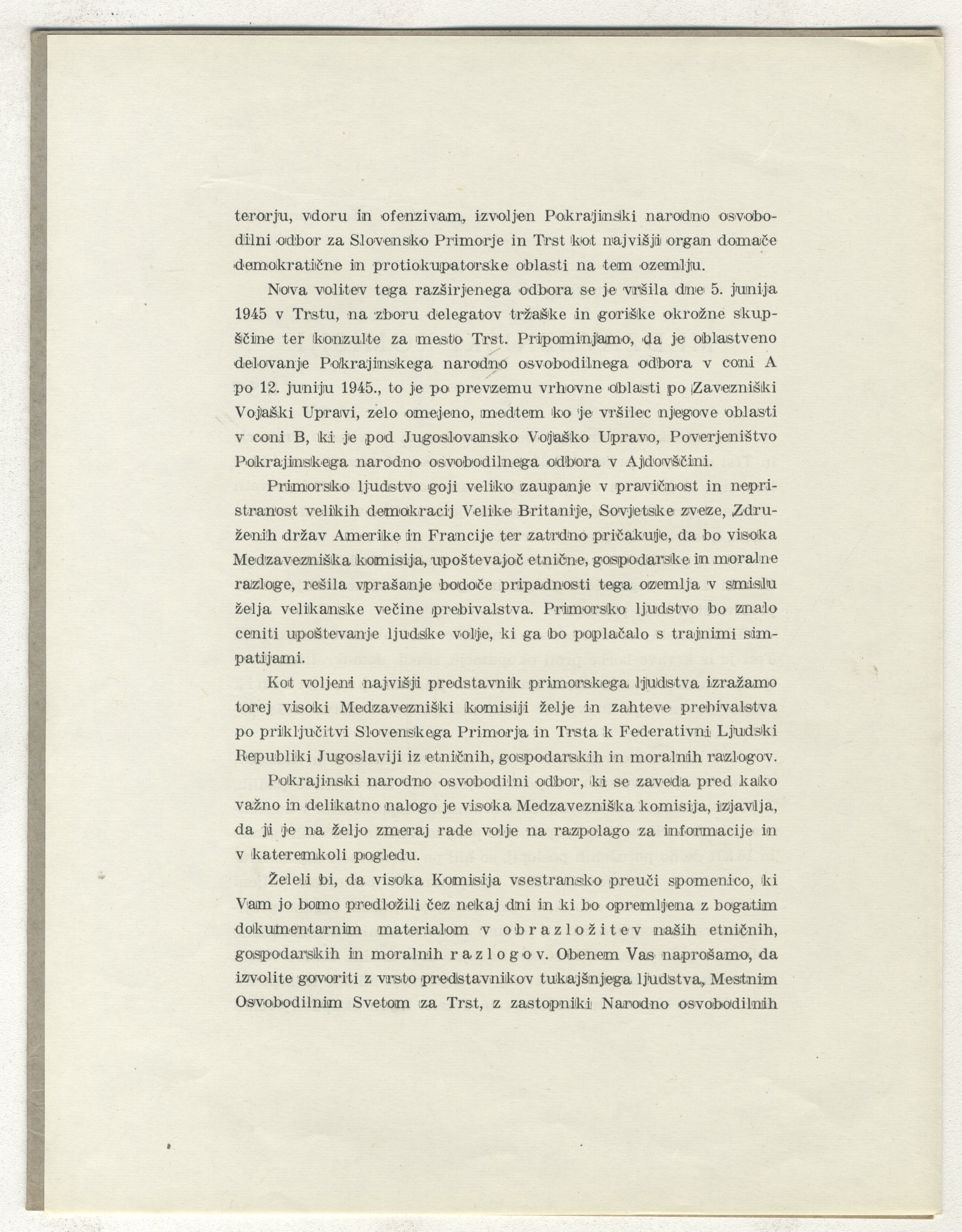 Spomenica in pozdravni dopis Pokrajinskega narodnoosvobodilnega odbora za Slovensko primorje in Trst Medzavezniški razmejitveni komisiji