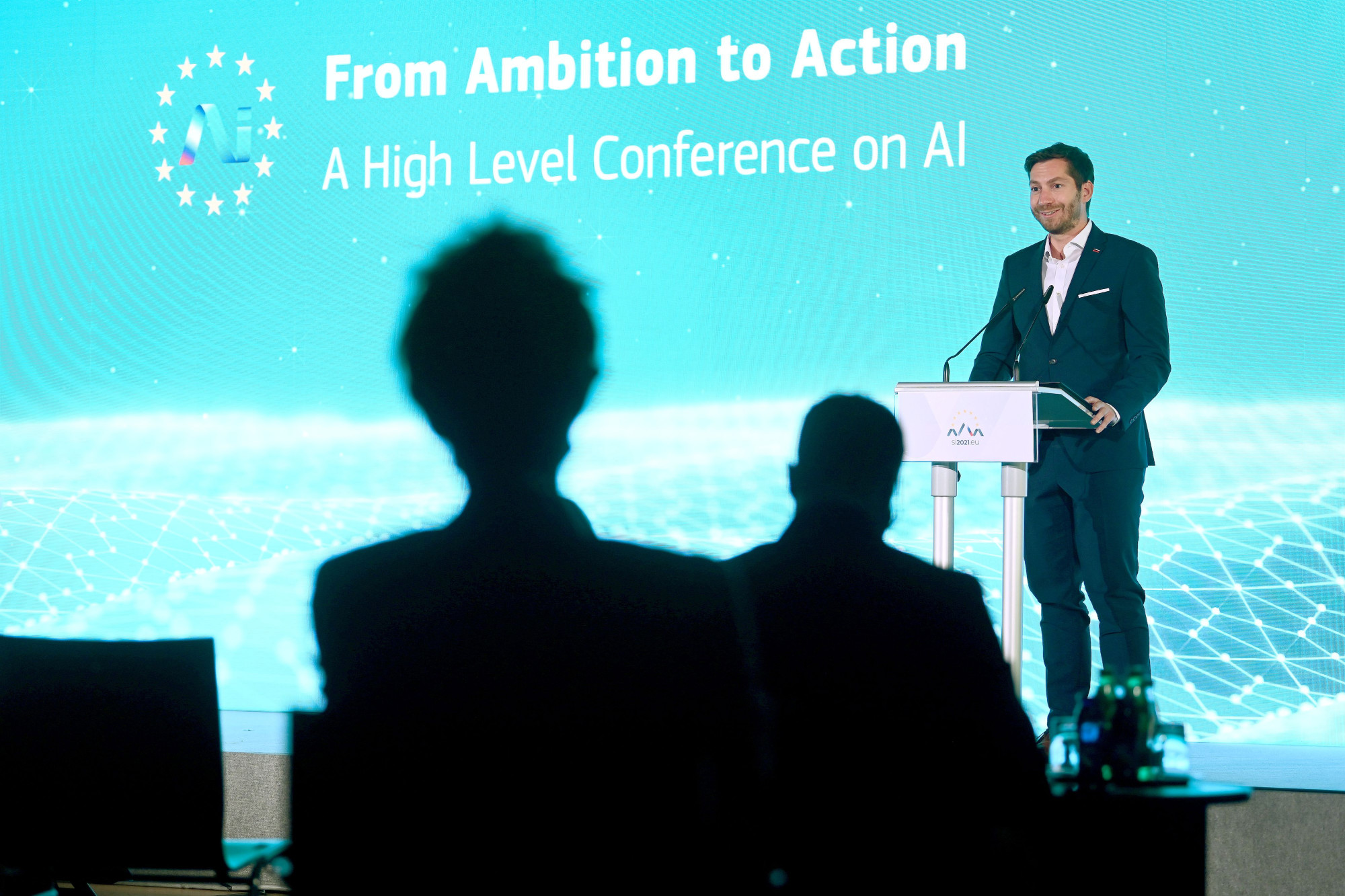 Minister Mark Boris Andrijanič je bil govornik na konferenci o umetni inteligenci, z naslovom: AI: od ambicij do ukrepov. | Avtor: Tamino Petelinšek, STA