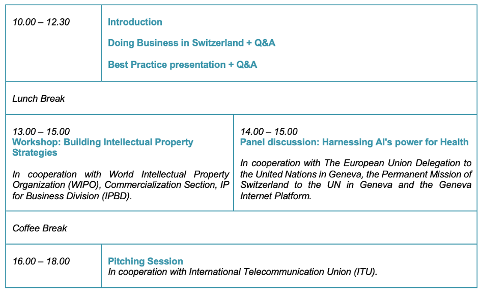 Virtualni program bo zajemal predstavitev in delavnico o vstopanju na švicarski trg, poslovanju na švicarskem trgu ter relevantnih zakonodajnih okvirih s posebnim poudarkom na področju tehnoloških podjetij s področja zdravja. Spoznali bomo najboljše poslovne prakse na slovenskem in švicarskem trgu ter tkali nove stike in poznanstva na tem naprednem trgu. V sodelovanju s Svetovno organizacijo za intelektualno lastnino s sedežem v Ženevi bodo udeležena podjetja spoznavala pomen vrednotenja intelektualne lastnine in pomembne podrobnosti, ki jih morajo upoštevati tehnološka podjetja, v sodelovanju z Mednarodno zvezo za telekomunikacije pa bodo mlada zagonska podjetja svoje rešitve predstavila panelu strokovnjakov (pitching) s področja prihodnosti zdravja in tehnologij. Program bo zaokrožala tudi javna panelna razprava o priložnostih, ki jih predstavlja umetna inteligenca na področju javnega zdravja in medicine.