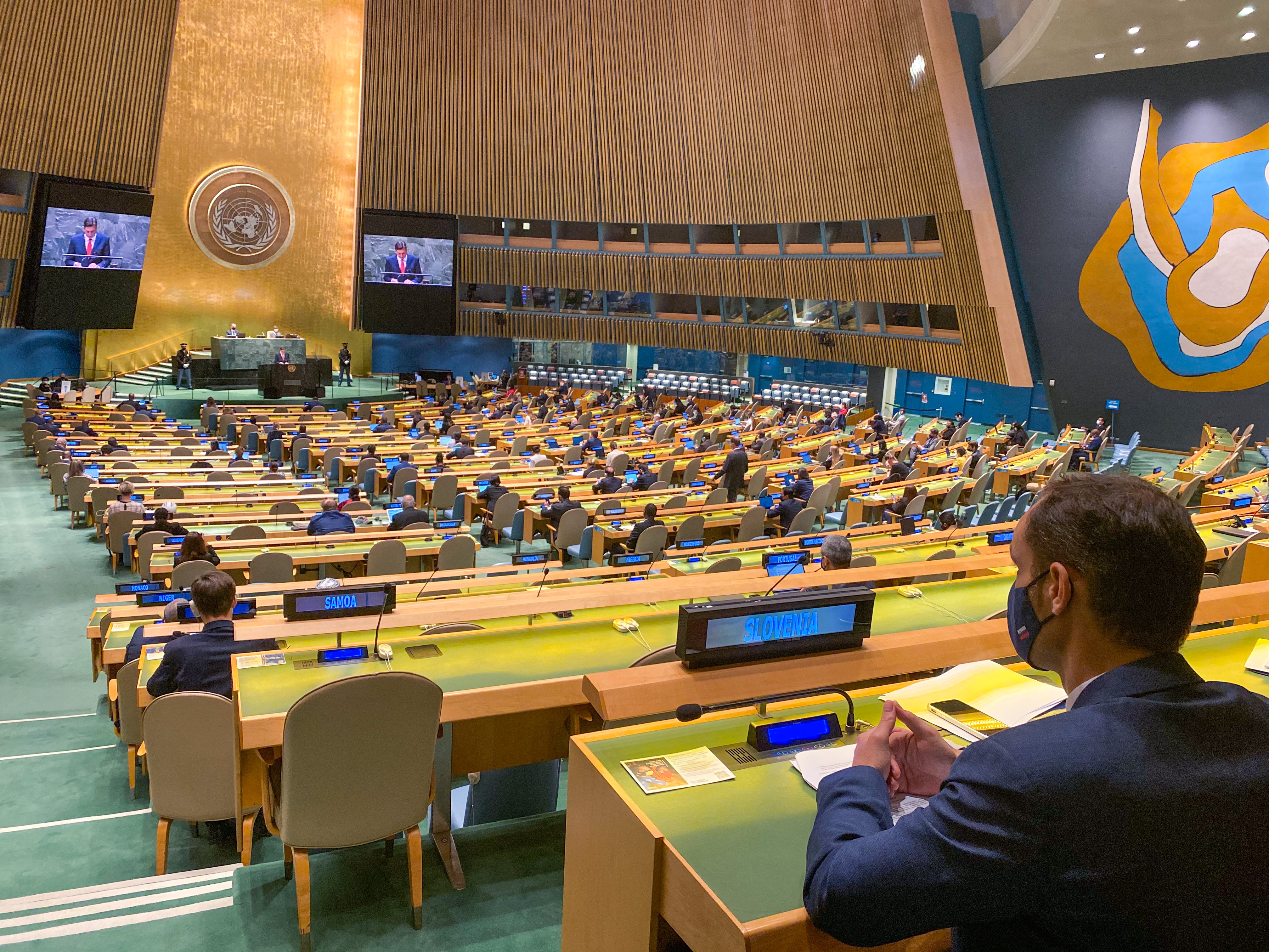 Minister dr. Logar je danes v Generalni skupščini spremljal nagovor predsednika RS Boruta Pahorja. Predsednik Pahor je v svojem nagovoru pozval k solidarnosti pri spopadanju s pandemijo covida-19 in izpolnjevanju zavez na področju podnebnih sprememb, ki vplivajo tudi na pomanjkanje vode. Izpostavil je pomen digitalizacije in novih tehnologij pri soočanju z aktualnimi izzivi. Opozoril je na pereče humanitarne in varnostne razmere po svetu ter poudaril pomen spoštovanja mednarodnega prava in človekovih pravic.