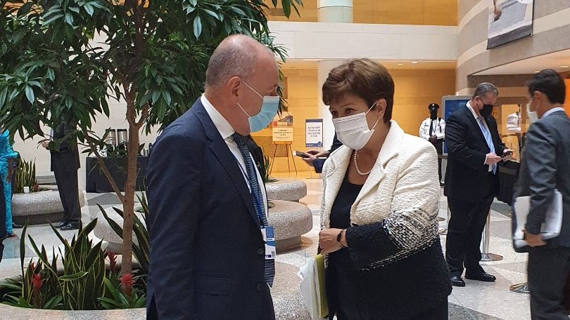 Minister je najprej opravil sestanek z vodjo misije Mednarodnega denarnega sklada za Slovenijo Bernardinom Akitobyjem. Vodja misije je izpostavil, da izboljšana napoved za Slovenijo kaže, da so bili ukrepi za spopadanje s pandemijo pravi. Mednarodni denarni sklad v novi ekonomski napovedi namreč Sloveniji napoveduje 6,3 % gospodarsko rast za letošnje leto in 4,6 % za prihodnje leto, kar je nad evropskim povprečjem in povprečjem evroobmočja. Stopnja nezaposlenosti po napovedih Mednarodnega denarnega sklada za leti 2021 in 2022 ostaja krepko pod povprečjem evroobmočja. Za Slovenijo napovedujejo 4,5 % nezaposlenost v letu 2021 in 4,3 % v letu 2022, medtem ko za evroobmočje napovedujejo 8 % nezaposlenost v letu 2021 in 8,1 % v letu 2022.