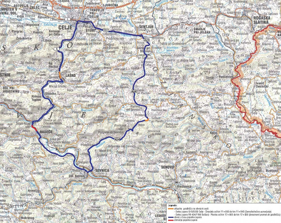 V času popolne zapore bo promet potekal po obvozu: Zidani Most–Celje–Šentjur–Planina pri Sevnici–Sevnica–Radeče in obratno.