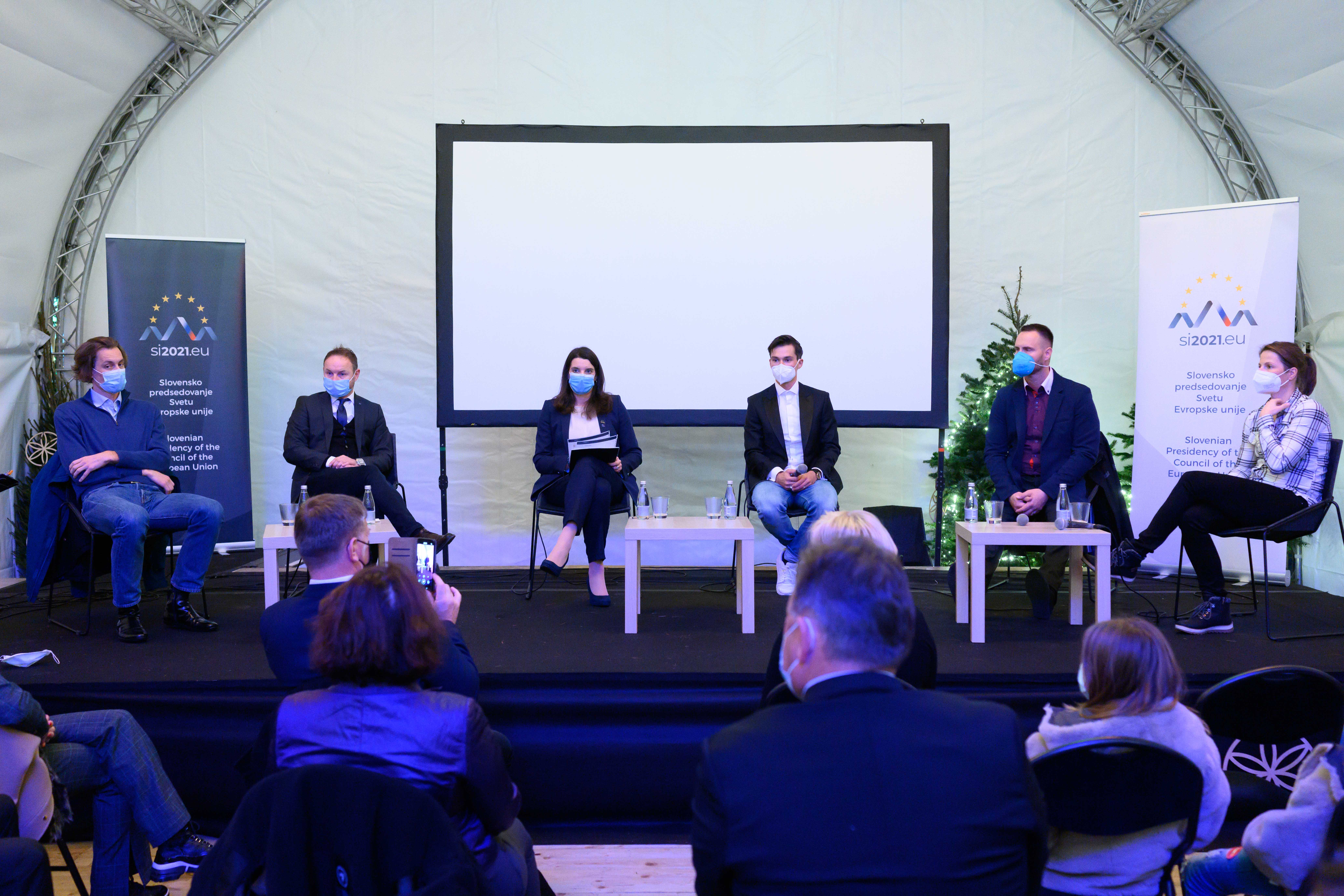 V pogovoru z ministrico Simono Kustec o vlogi športa v družbi so sodelovali tudi nekateri slovenski vrhunski športniki, med njimi kolesar Primož Roglič, paraolimpijec Dejan Fabčič, nekdanja športnika smučarska tekačica Vesna Fabjan in atlet Rožle Prezelj. | Avtor: UKOM