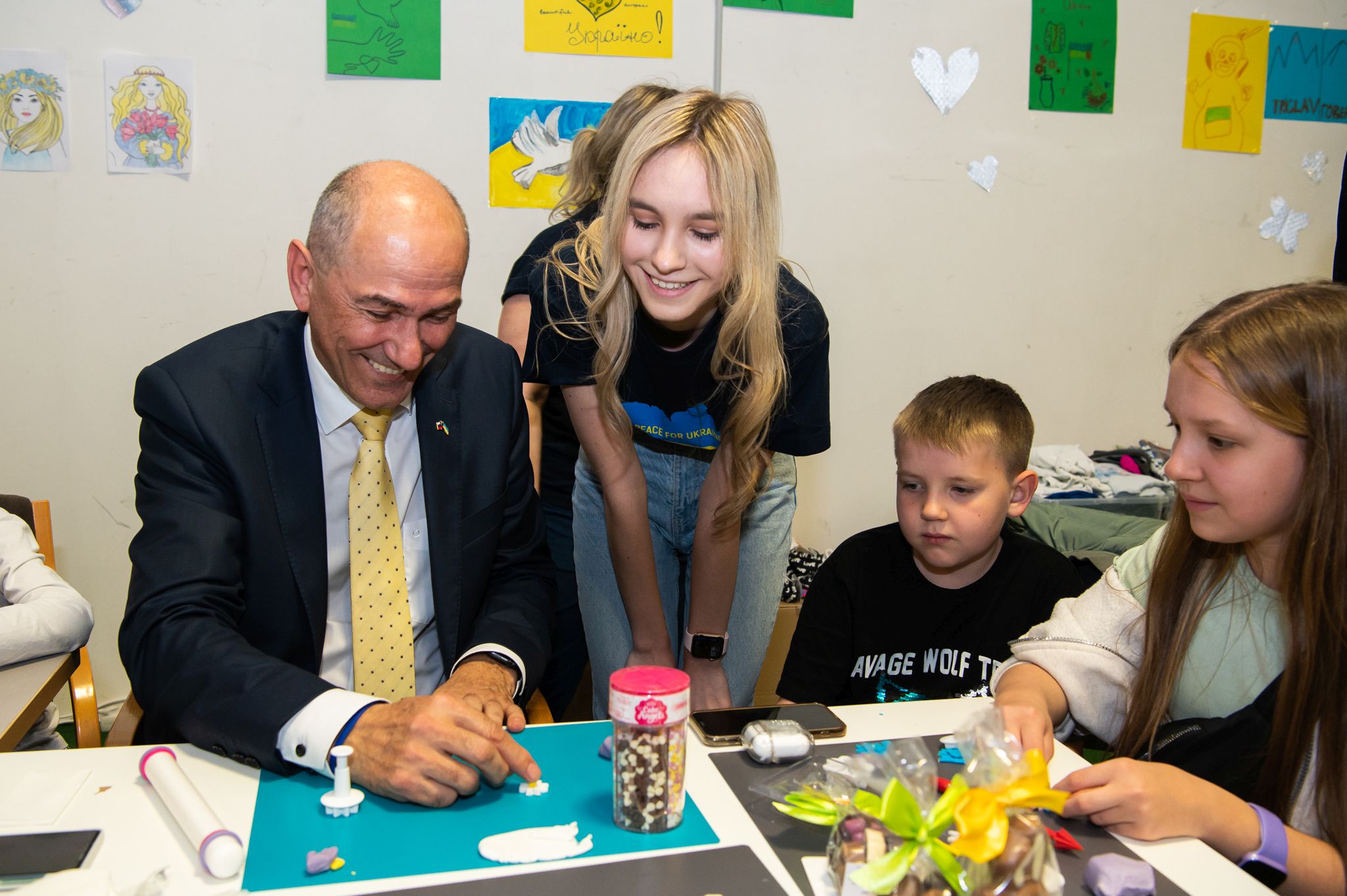 Predsednik vlade je ukrajinske otroke obdaril z velikonočno pisanko. Prav tako pa je z njimi ustvarjal dekoracijo za ukrajinski tradicionalni kruh.