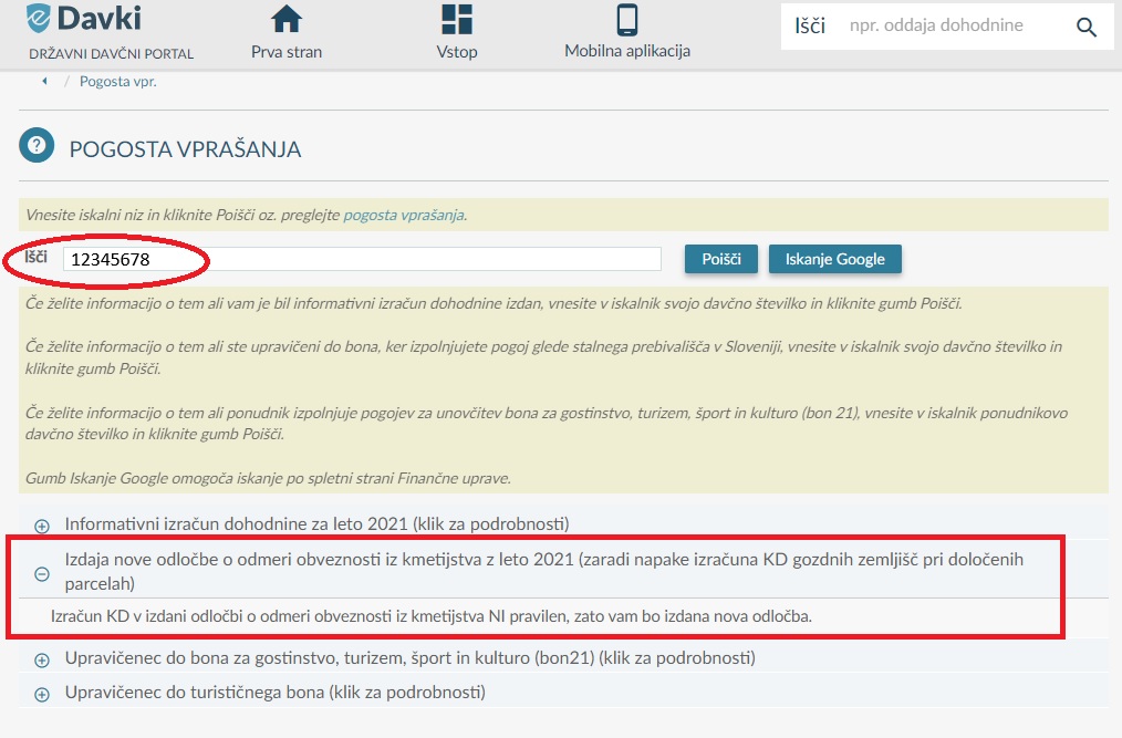 Vse zavezance, ki so v začetku maja 2022 prejeli odločbo o odmeri obveznosti iz kmetijstva za leto 2021 in se z njo ne strinjajo, naj takoj, najpozneje pa do 6. 6. 2022 preverijo, če bodo prejeli novo odločbo. To preverijo tako, da v iskalnik spletnega portala eDavki vnesejo svojo davčno številko. Na ta način bodo prejeli informacijo o morebitni izdaji nove odločbe (glejte sliko). Tisti, ki ne morejo dostopati do spleta, pa lahko pokličejo klicni center na Finančne uprave (08 200 1001) in bodo prejeli informacijo po telefonu.