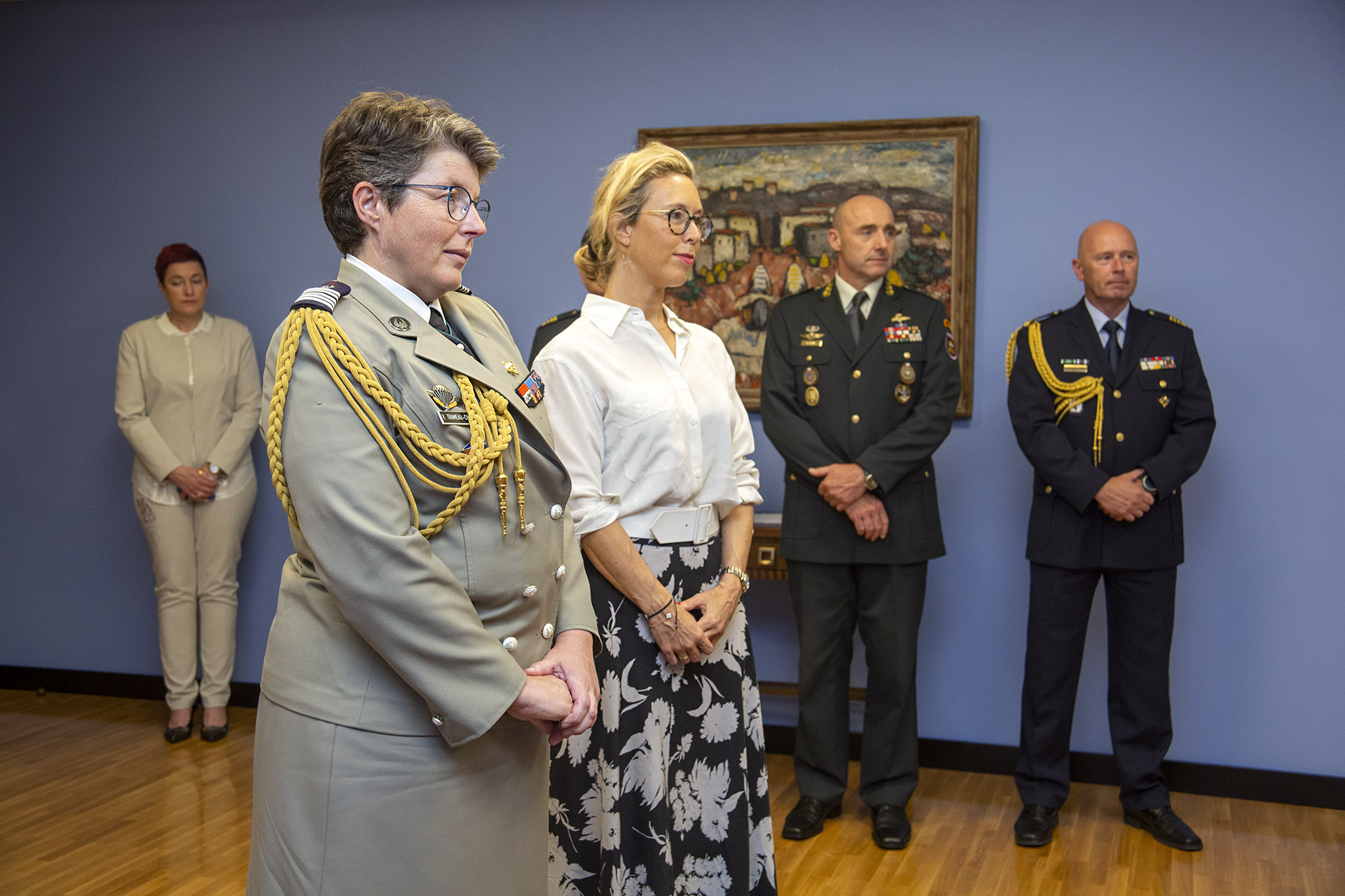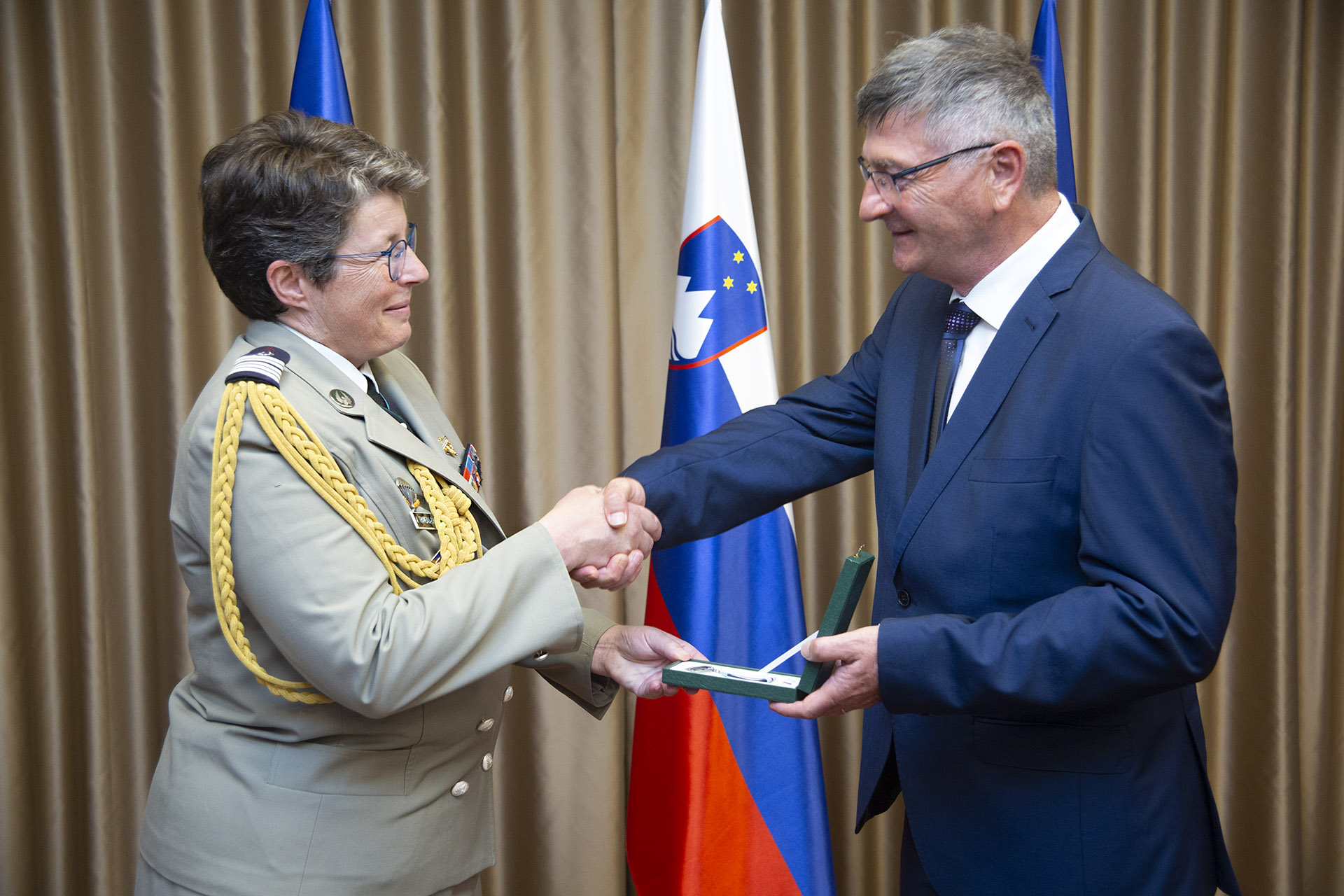 Državni sekretar Rudi Medved je na krajši slovesnosti izročil medaljo za mednarodno sodelovanje II. stopnje atašejki Francoske republike v Sloveniji polkovnici Valerie Trameau Chabert | Avtor: Bruno Toič