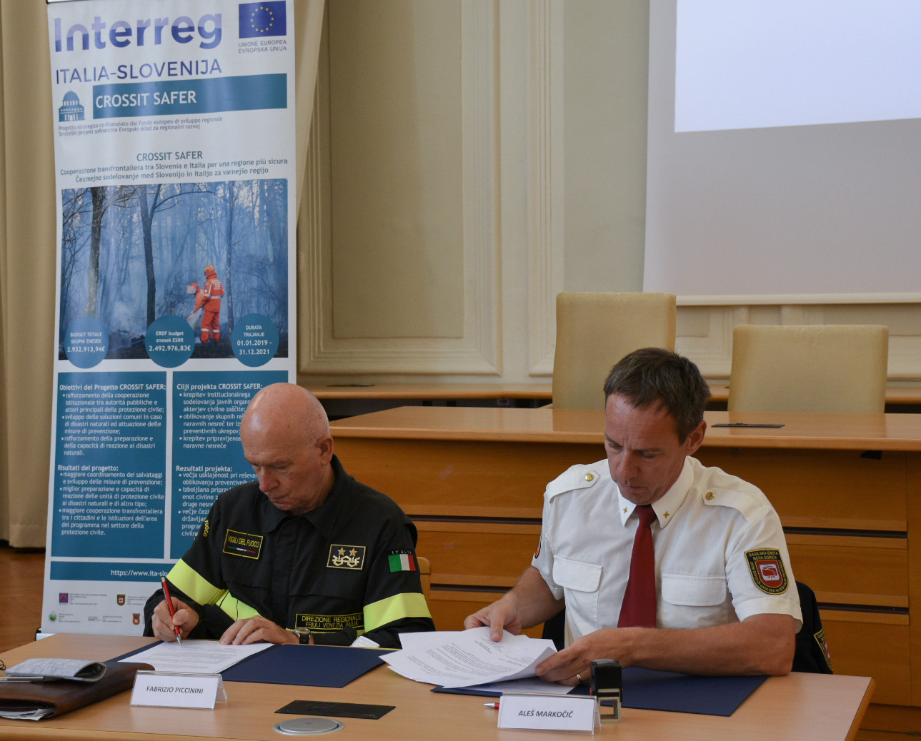 Sporazuma o sodelovanju med gasilskimi enotami na obmejnem območju med Republiko Slovenijo in Republiko Italijo je na italijanski strani podpisal Deželni direktor gasilske službe za Furlanijo Julijsko krajino Fabrizio Piccinini, na slovenski strani pa direktorji petih poklicnih gasilskih enot oziroma zavodov (Koper, Sežana, Ajdovščina, Nova Gorica in Jesenice) in župani 18 slovenskih obmejnih občin (Kranjska Gora, Jesenice, Bovec, Kobarid, Tolmin, Kanal ob Soči, Brda, MO Nova Gorica, Šempeter–Vrtojba, Renče–Vogrsko, Miren–Kostanjevica, Ajdovščina, Komen, Sežana, Divača, Hrpelje–Kozina, MO Koper, Ankaran).