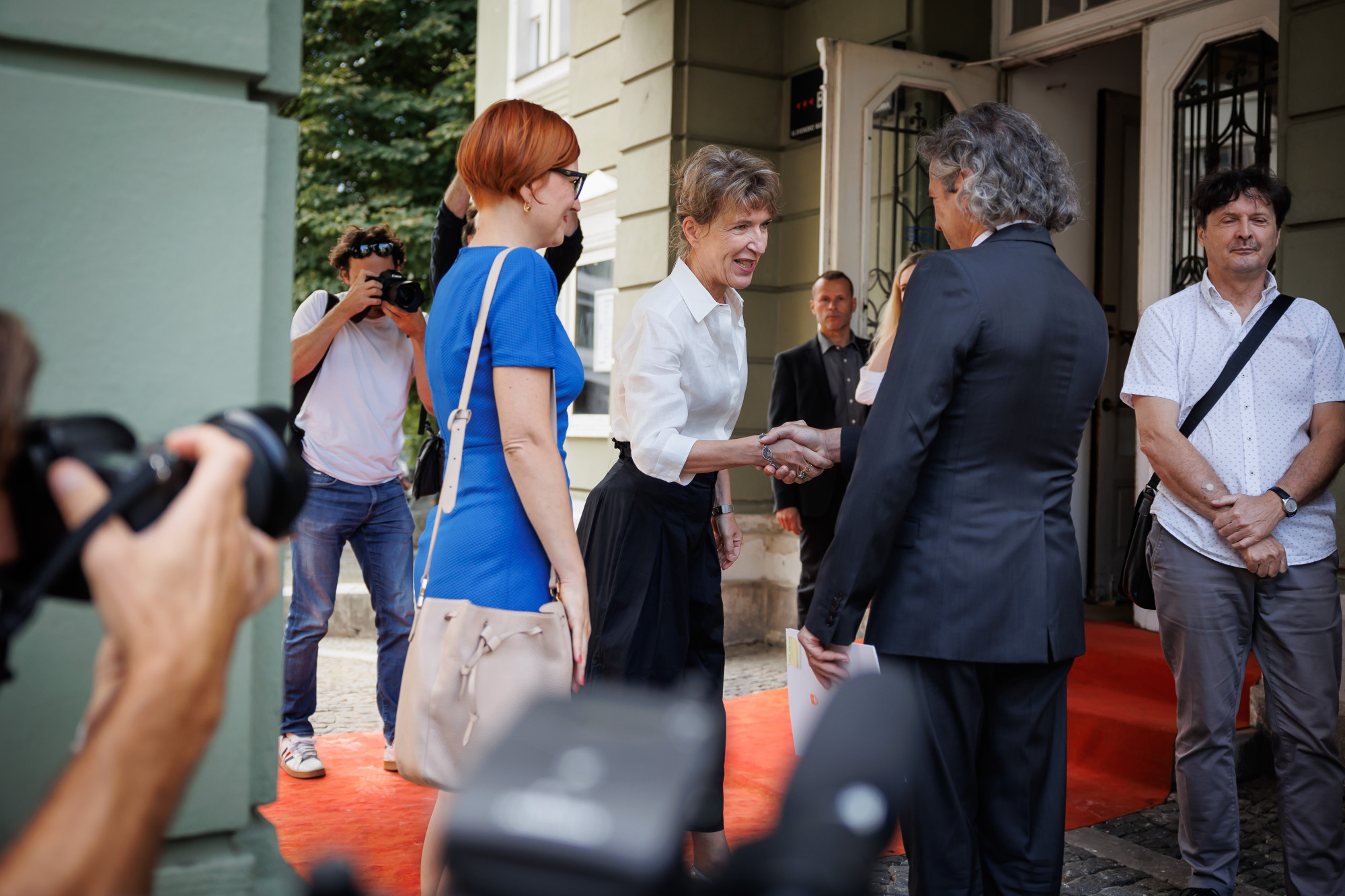 Z leve: ravnateljica Drame Vesna Jurca Tadel, pomočnik ravnateljice Luka Nabergoj, arhitekt Miroslav Benulič, državni sekretar Matevž Čelik Vidmar, ministrica dr. Asta Vrečko, predsednik vlade dr. Robert Golob | Avtor: Nebojša Tejić/STA