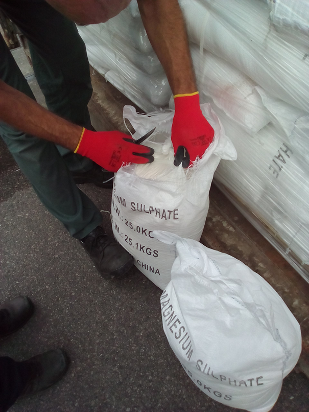 Po uradnih podatki uvoznika je bilo v kontejnerju deklarirano blago MAGNESIUM SULPHATE v količini 20 palet, bruto teže 18,6 tone. Po podatkih iz deklaracije in uvoznega računa je bil pošiljatelj družba iz Kitajske, uvoznik družba na Madžarskem, končni prejemnik blaga pa družba na Nizozemskem.