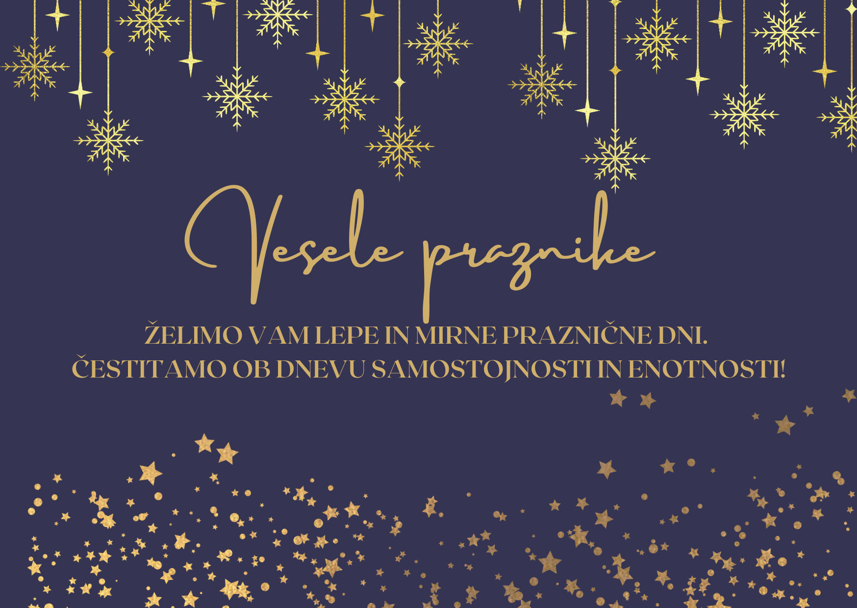 V prihajajočih božično-novoletnih prazničnih dneh se ozremo v preteklo leto. To je čas, ko več trenutkov preživimo s svojimi najbližjimi, ko si zaželimo sreče in zdravja v prihajajočem letu, sklepamo osebne zaobljube in naberemo novih moči za nove korake. Želimo vam lepe in mirne praznične dni ter čestitamo ob dnevu samostojnosti in enotnosti!