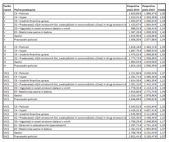 Povprečna plača vzgojiteljice z visokošolsko izobrazbo je bila v letu 2022 okoli 2.100 evrov, medtem ko je za gasilca z visokošolsko izobrazbo v letu 2022 znašala skoraj 3.000 evrov.