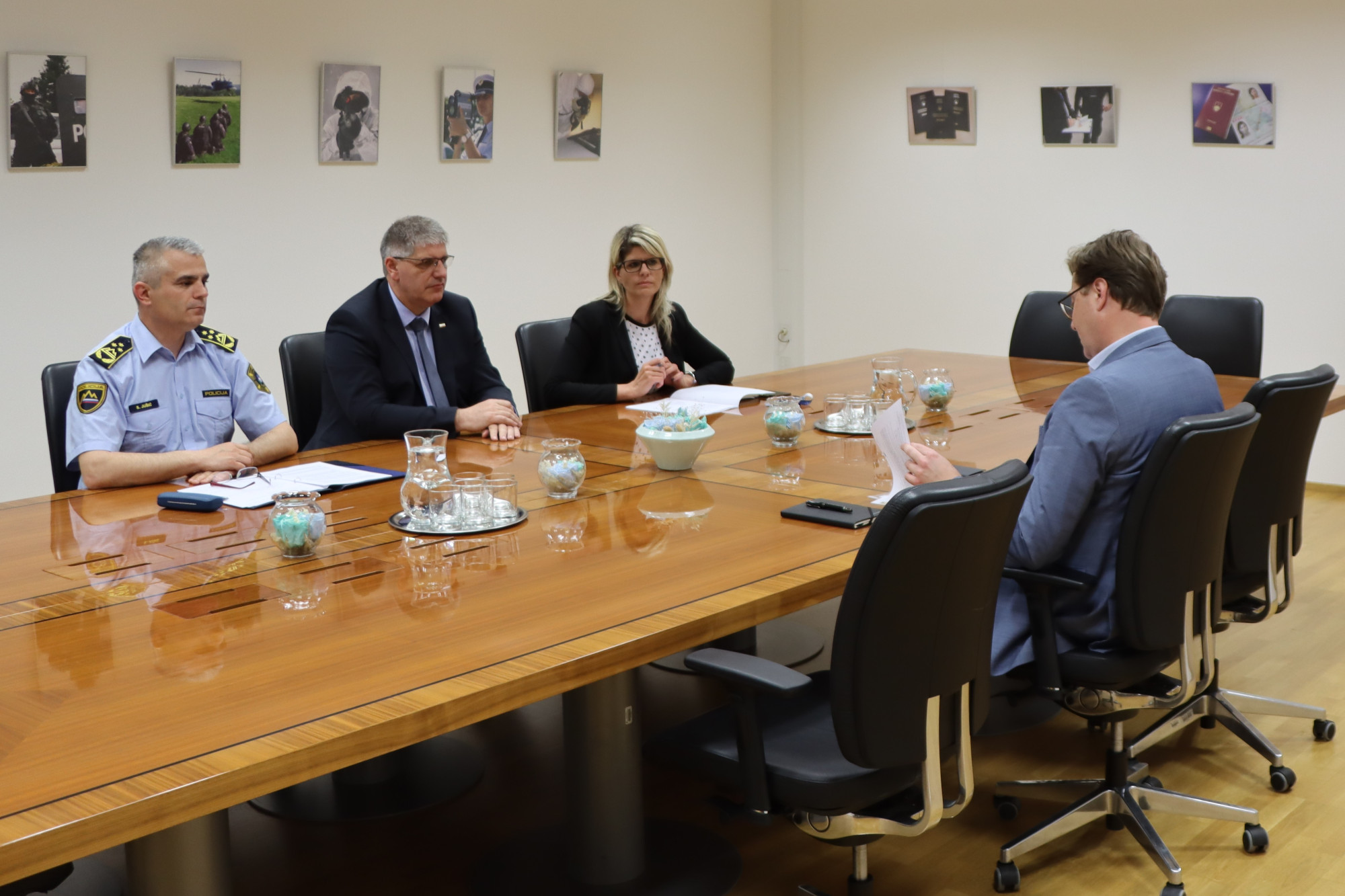 Vršilec dolžnosti generalnega direktorja policije Senad Jušić, minister za notranje zadeve Boštjan Poklukar, vodja kabineta ministra Nataša Hvala Ivančič (z leve) na sestanku z županom Občine Kočevje Vladmirjem Prebiličem | Avtor: Ministrstvo za notranje zadeve
