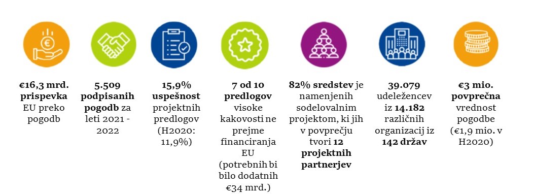 Evropska komisija je objavila nekatere ključne podatke o izvajanju okvirnega programa EU za raziskave in inovacije Obzorje Evropa v letih 2021 in 2022 (poročilo v angleškem jeziku Horizon Europe Implementation 2021-2022 - Key figures v2). 31 odstotkov sredstev celotnega programa, katerega skupna vrednost znaša 95,5 milijard evrov, je bilo z letom 2022 že dodeljenih prijaviteljem, 12 odstotkov sredstev je tudi že izplačanih. Skrb zbujajoč je podatek, da kar 70 odstotkov vseh predlaganih projektov, ki so z vidika kakovosti pozitivno ocenjeni, zaradi omejitev proračuna ne prejme sredstev programa Obzorje Evropa. V kolikor bi želeli iz programa financirati vse pozitivno ocenjene projektne predloge, bi program Obzorje Evropa že v tem trenutku potreboval dodatnih 34 milijard evrov. Ob tem je pomembno izpostaviti tudi dejstvo, da se, po trenutno razpoložljivih podatkih, raven kakovosti predlaganih projektov krepi, saj je bilo v programu Obzorje Evropa pozitivno ocenjenih 54 odstotkov vseh projektnih predlogov, medtem ko je bilo v preteklem programu Obzorje 2020 pozitivno ocenjenih 46 odstotkov vseh projektnih predlogov.