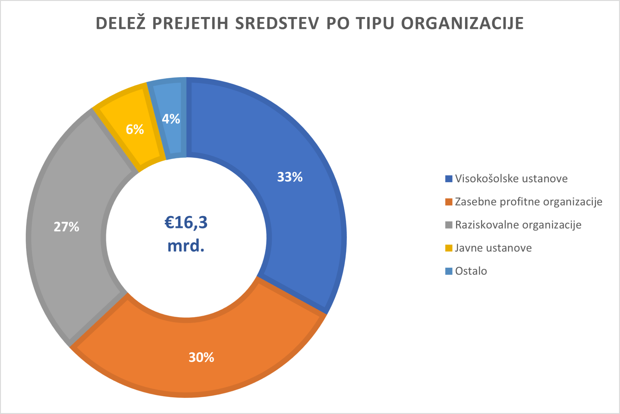 Glede na delež prejetih sredstev programa Obzorje Evropa so sicer prijavitelji iz raziskovalnih organizacij uspešnejši, saj prejmejo 27 odstotkov vseh razpoložljivih sredstev in zgolj minimalno zaostajajo za prijavitelji iz visokošolskih ustanov (33 odstotkov) in prijavitelji iz zasebnih profitnih organizacij (30 odstotkov). Ob tem velja izpostaviti, da so razmerja po tipu udeležencev primerljiva s podatki programa Obzorje 2020. Pomemben dosežek celotnega programa Obzorje Evropa predstavlja tudi podatek, da več kot 30 odstotkov vseh udeležencev predstavljajo nove institucije in organizacije, ki doslej niso sodelovale v okvirnih programih EU.