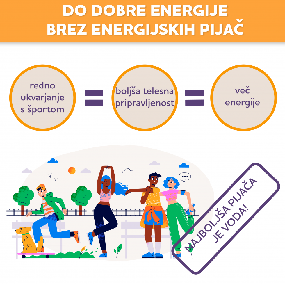Ministrstvo za zdravje, Ministrstvo za vzgojo in izobraževanje, Nacionalni inštitut za javno zdravje, Sekcija za primarno pediatrijo, Sekcija za šolsko, študentsko in adolescentno medicino, Fakulteta za šport, Inštitut za nutricionistiko, Olimpijski komite Slovenije ̶ Združenje športnih zvez, SLOADO ̶ Slovenska antidoping organizacija in Zveza potrošnikov Slovenije ob podpori nevladnih organizacij, ki se ukvarjajo z zdravjem mladih, v tem tednu ponovno stopamo skupaj, da opozorimo, da energijske pijače niso primerne za otroke in mladostnike. Za moč in energijo mladi potrebujejo predvsem uravnoteženo prehrano, redno ukvarjanje s športom ter kakovosten spanec oziroma dovolj počitka.