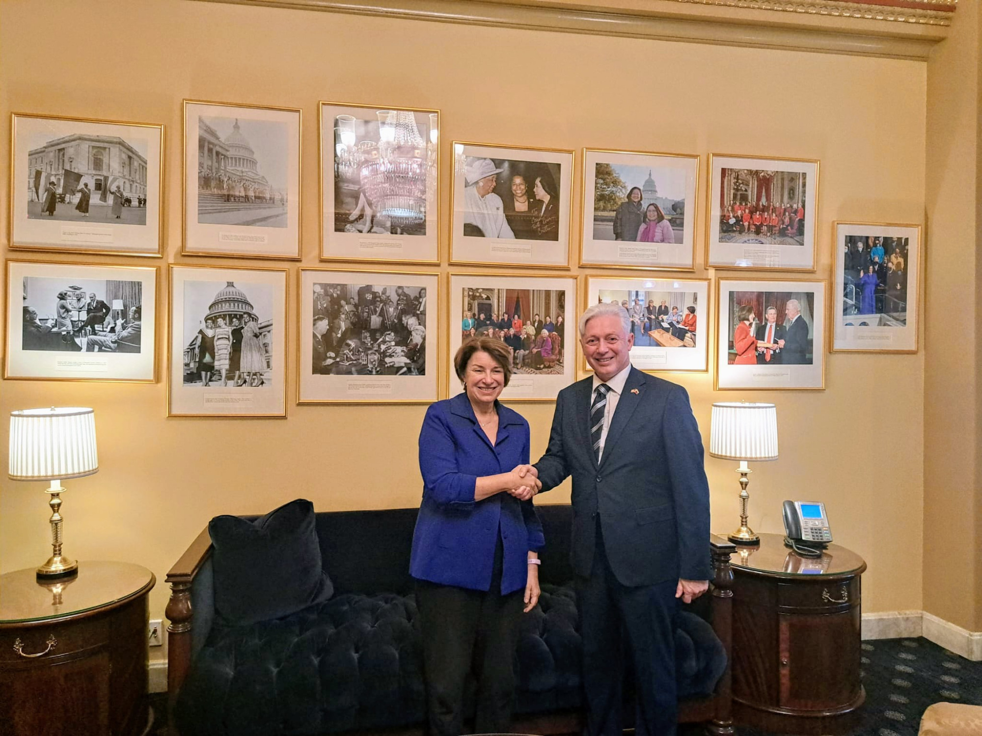 Slovenski veleposlanik v ZDA Iztok Mirošič in senatorka Amy Klobuchar iz Minnesote, ki je slovenskega porekla, sta na srečanju v Kongresu ZDA razpravljala o pomenu krepitve sodelovanja med Slovenijo in Združenimi državami Amerike, transatlanskih odnosih in o aktualnih mednarodnih izzivih. Veleposlanik Mirošič se je zahvalil senatorki Klobuchar za predsedovanje Skupini prijateljstva s Slovenijo v Senatu.