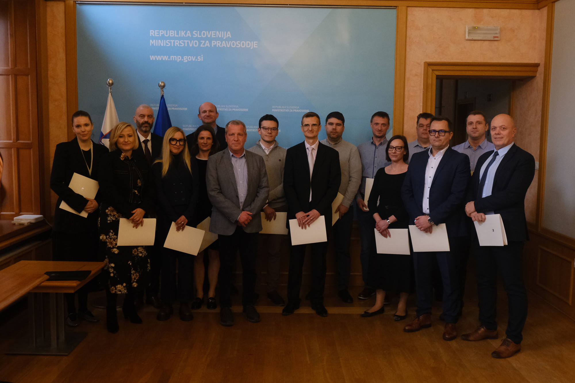 Pred državnim sekretarjem na Ministrstvu za pravosodje dr. Igorjem Šoltesom so zaprisegli sodni izvedenci, sodni cenilec in sodni tolmači.
