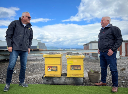 Ob svetovnem dnevu čebel si je minister za naravne vire in prostor Jože Novak skupaj s čebelarjem, sicer županom Občine Horjul Jankom Prebilom ogledal čebelnjak na strehi ministrstva.