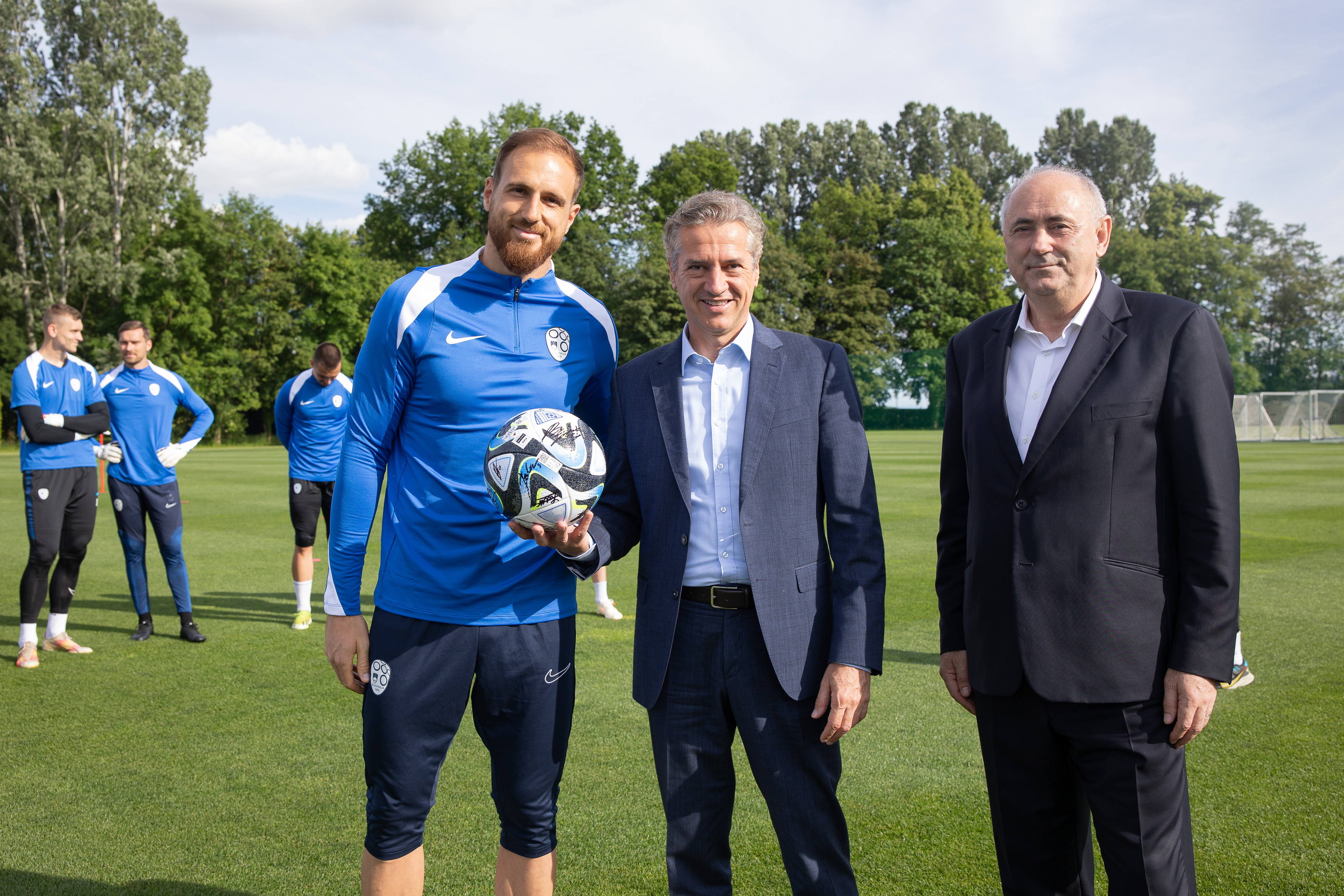 Kapetan slovenske reprezentance Jan Oblak, predsednik vlade Robert Golob in predsednik Nogometne zveze Slovenije Radenko Mijatović. | Avtor: Katja Kodba, STA