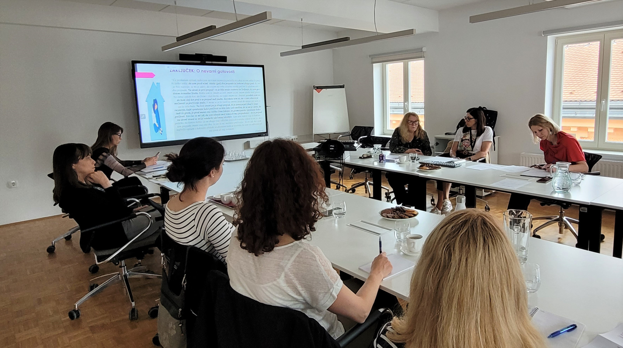 Na srečanju je bila izpostavljena vsebina knjige V njeni koži, ki jo je društvo izdalo v letu 2023 in je namenjena tako strokovni kot širši javnosti. Knjiga vsebuje 23 pogovorov, zapisanih v obliki zgodb žensk, ki so preko svoje osebne izkušnje delile različne vidike soočanja z nasiljem v intimnopartnerskih razmerjih. Pogovor z gostjama je tekel o nekaterih opisih doživljanj v zgodbah, iz katerih je razvidno, da se nasilje ne zgodi čez noč, temveč gre za proces s kompleksnim ozadjem in veliko dejavniki. Eden izmed ciljev izdaje knjige, ki je prosto dostopna na spletu, je tudi krepitev primerov dobrih praks in dvigovanje zaupanja v institucije, ki se poleg nevladnega sektorja vključujejo, oziroma v skladu s svojimi pristojnostmi obravnavajo primere nasilja.