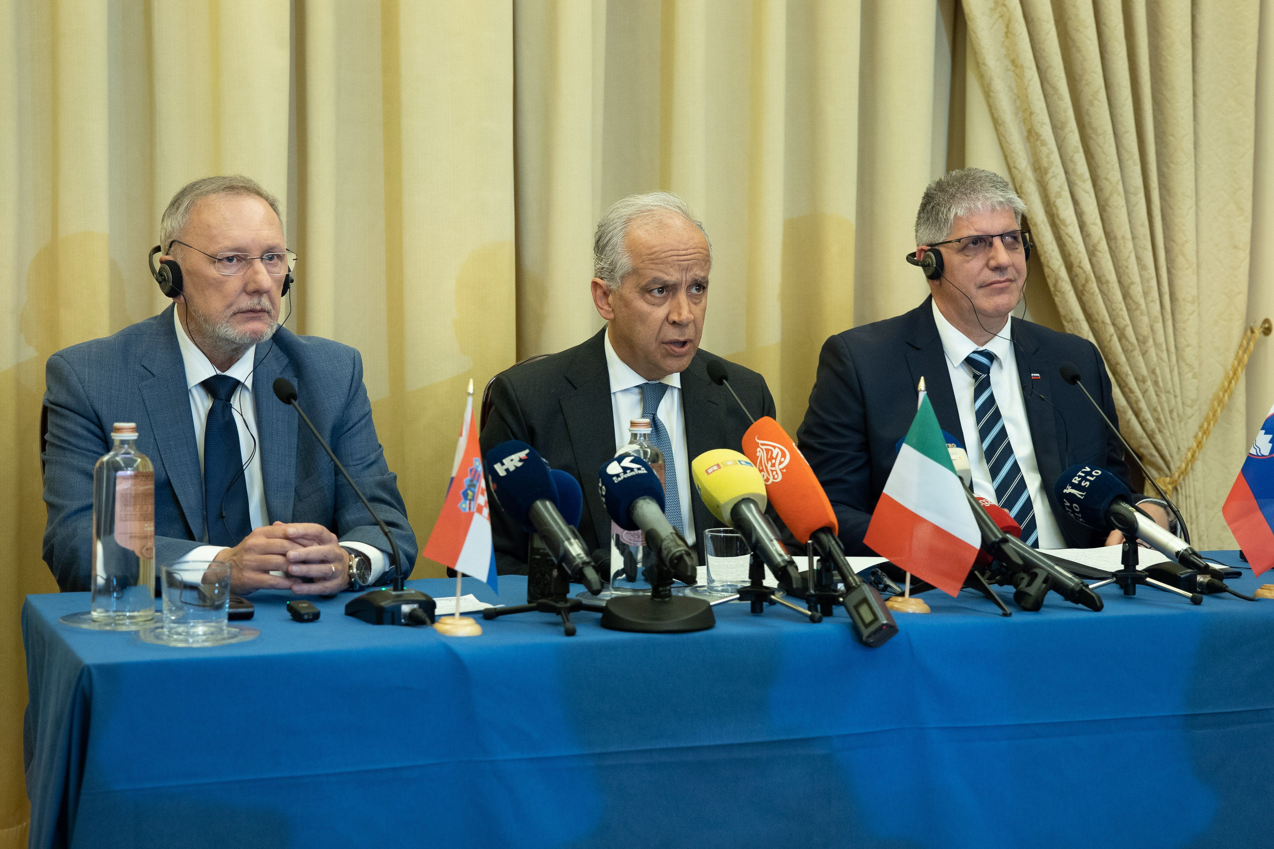 Ministri za notranje zadeve Hrvaške, Italije in Slovenije dr. Davor Božinović, Matteo Piantedosi in Boštjan Poklukar | Avtor: Katja Kodba/STA
