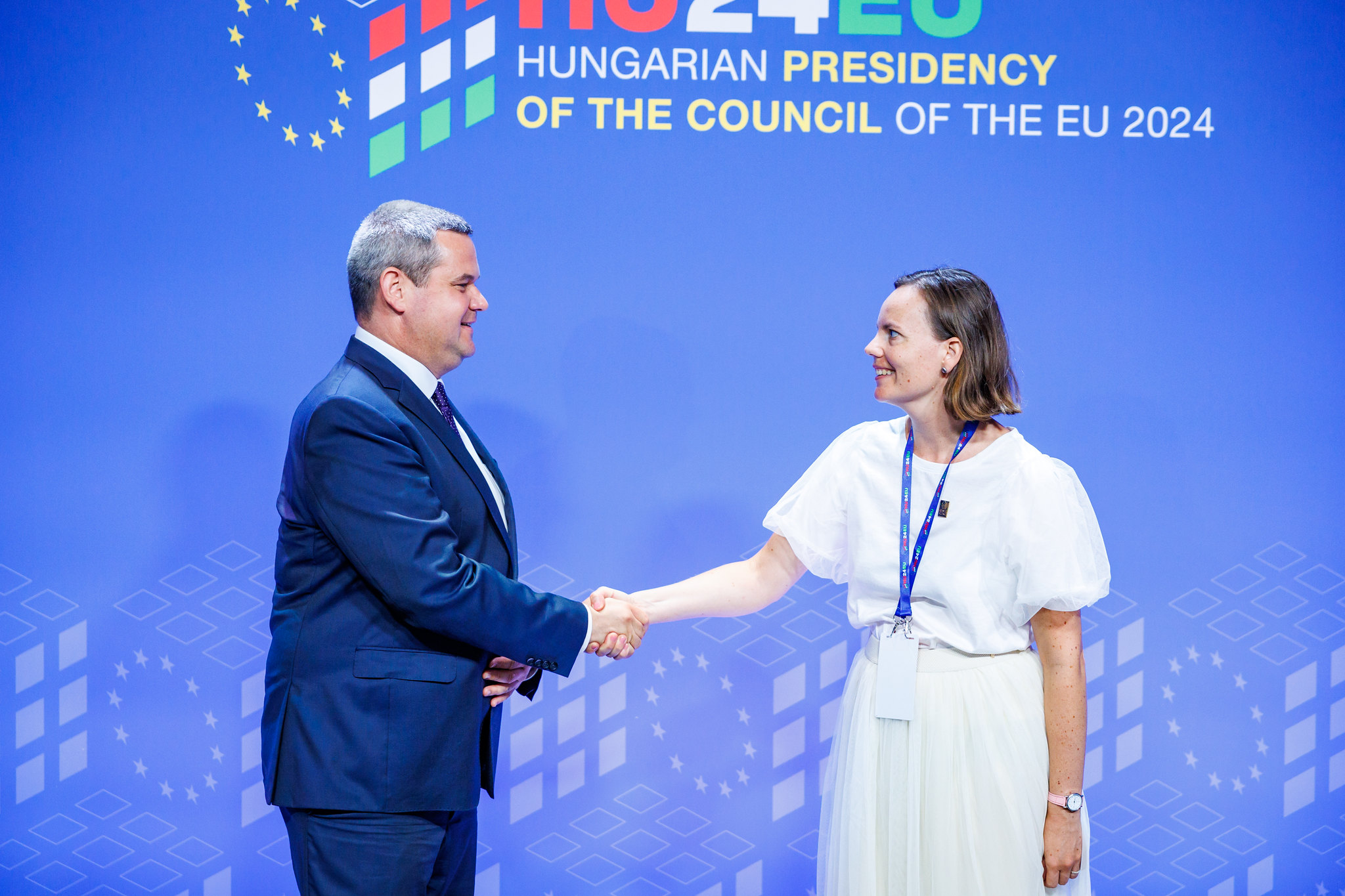 Državno sekretarko Evo Vodnik je ob prihodu na neformalno srečanje ministrov pozdravil gostitelj dr. Péter Takács, madžarski državni sekretar za zdravje.