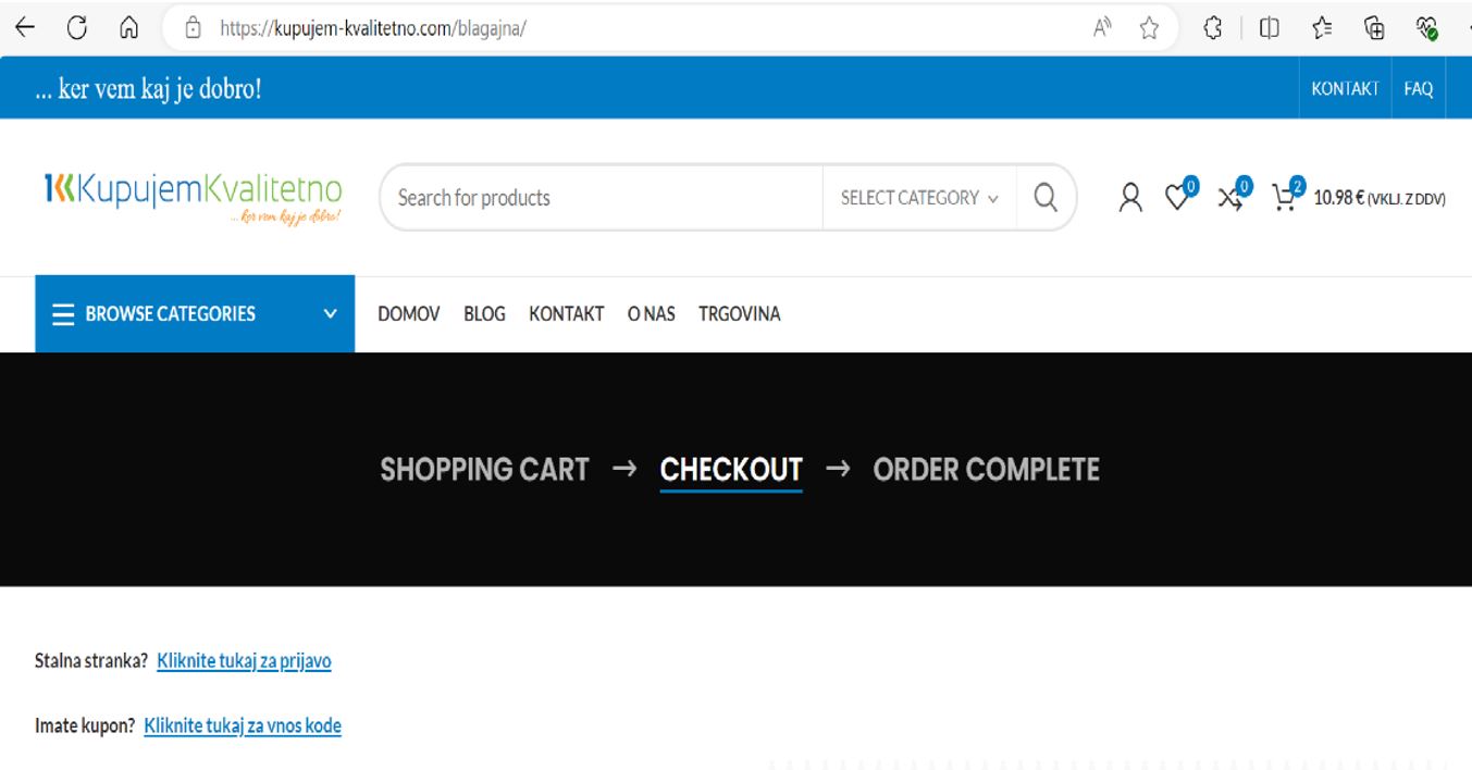 V okviru pregleda spletne trgovine na povezavi https://kupujem-kvalitetno.com inšpektorat ugotavlja, da je na dan 24. 10. 2024 še vedno mogoče izbrati izdelke in jih vložiti v košarico. Pred dokončnim nakupom pa je potrošnik obveščen, da ni na voljo razpoložljivih načinov plačila, da pa se lahko podjetje kontaktira in dogovori o alternativah. S tem se pojavlja možnost, da se potrošnik individualno dogovori o načinu plačila in s tem možnosti nakupa.