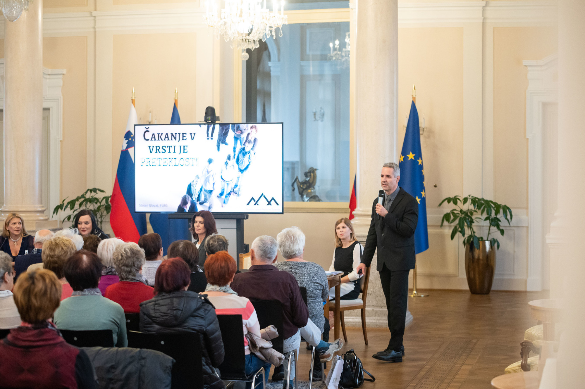 Po uvodnih predstavitvah smo naredili skupinsko fotografijo in nato je predstavnica Protokola Republike Slovenije obiskovalcem orisala zgodovino predsedniške palače in naloge državnega protokola.