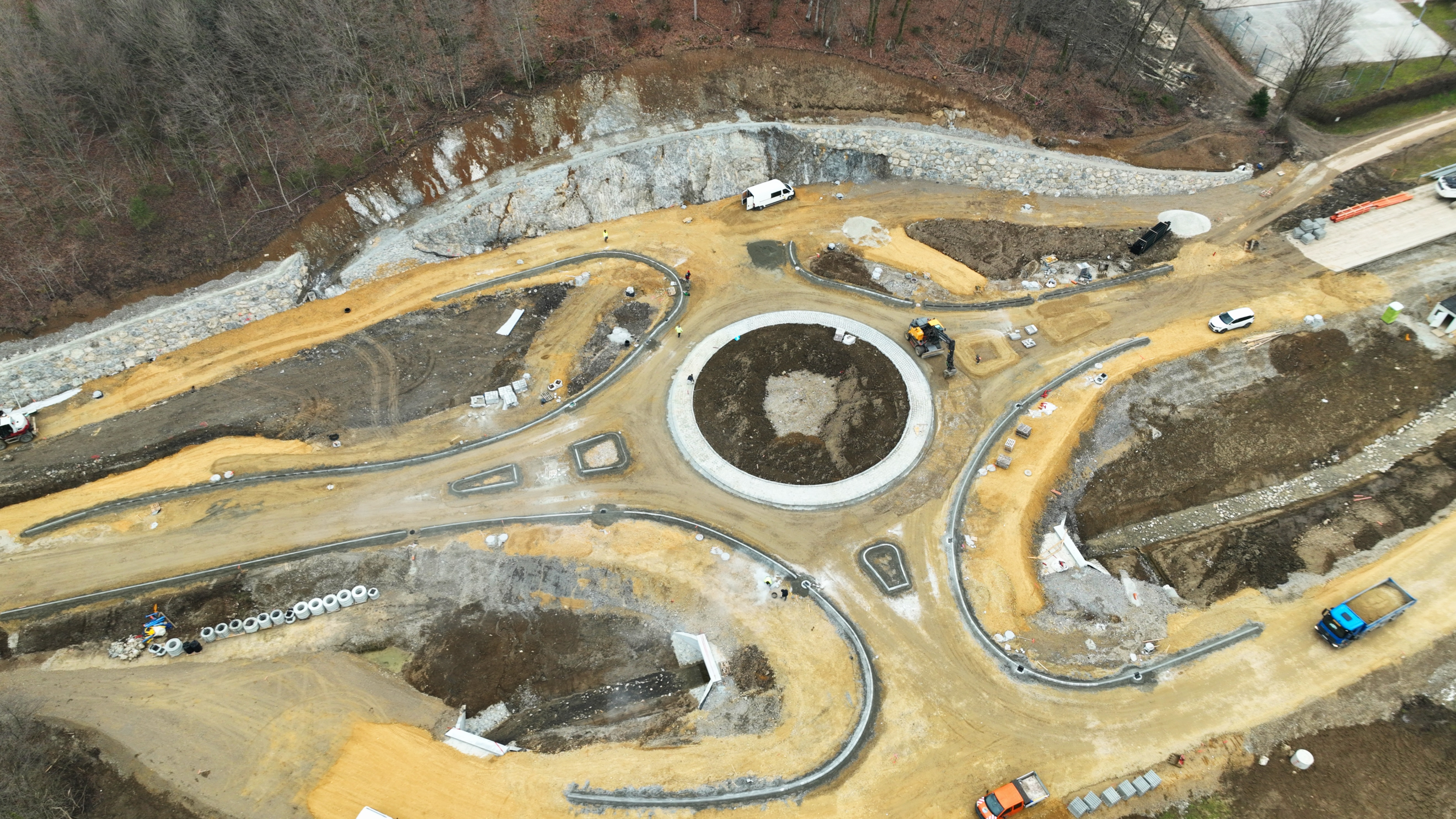 Trenutno je v teku izvedba drenaže, postavitev robnikov, izvedba nasipa, robnega venca na konstrukciji in cestne razsvetljave.